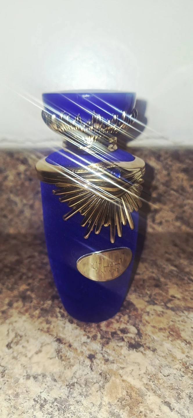 Selling a bottle of Lattifa Ihsan by Hayati perfume. The bottle is a beautiful blue with gold accents. It's in great condition and ready for a new owner!