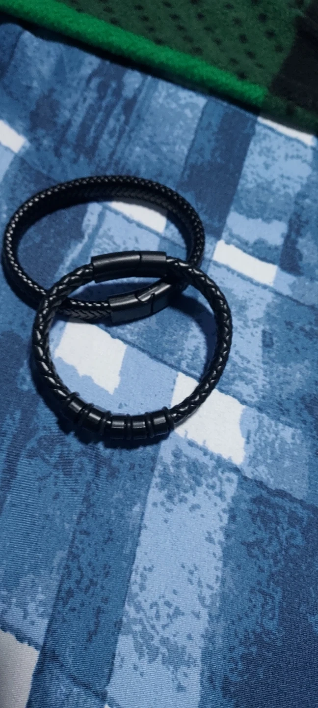 Selling a set of two black braided leather bracelets. They have a sleek and stylish look, perfect for everyday wear. The bracelets feature a magnetic clasp for easy closure. They are in good condition and ready for a new owner!