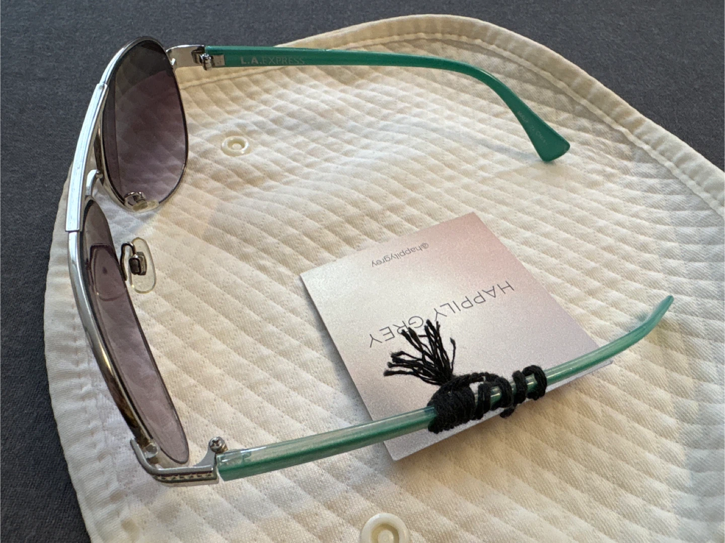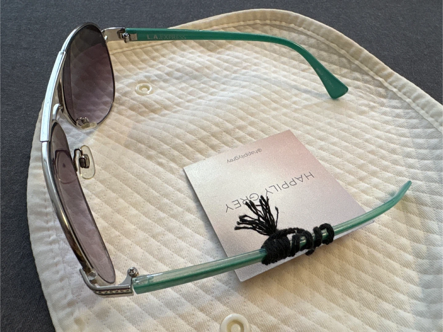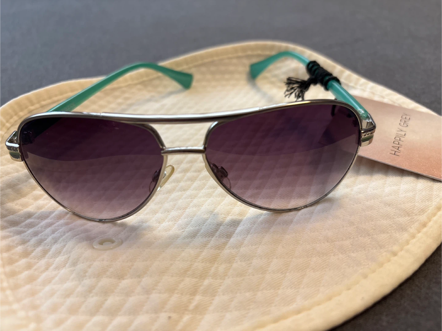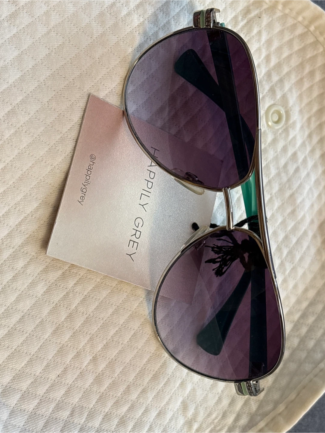 Selling a pair of Happily Grey sunglasses! They feature a stylish aviator design with purple gradient lenses and silver frames. The temples are a lovely shade of teal. Perfect for adding a touch of chic to any outfit