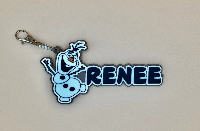 Custom made name Olaf Frozen Disney keychain. Made to order. Choose from 3 different styles of keychain rings (see all the pictures). Contact me if you have other character or font in your mind that you want to use. Local pick up/drop off is available in Whitby, ON. Please follow us on Instagram @umami3dprints