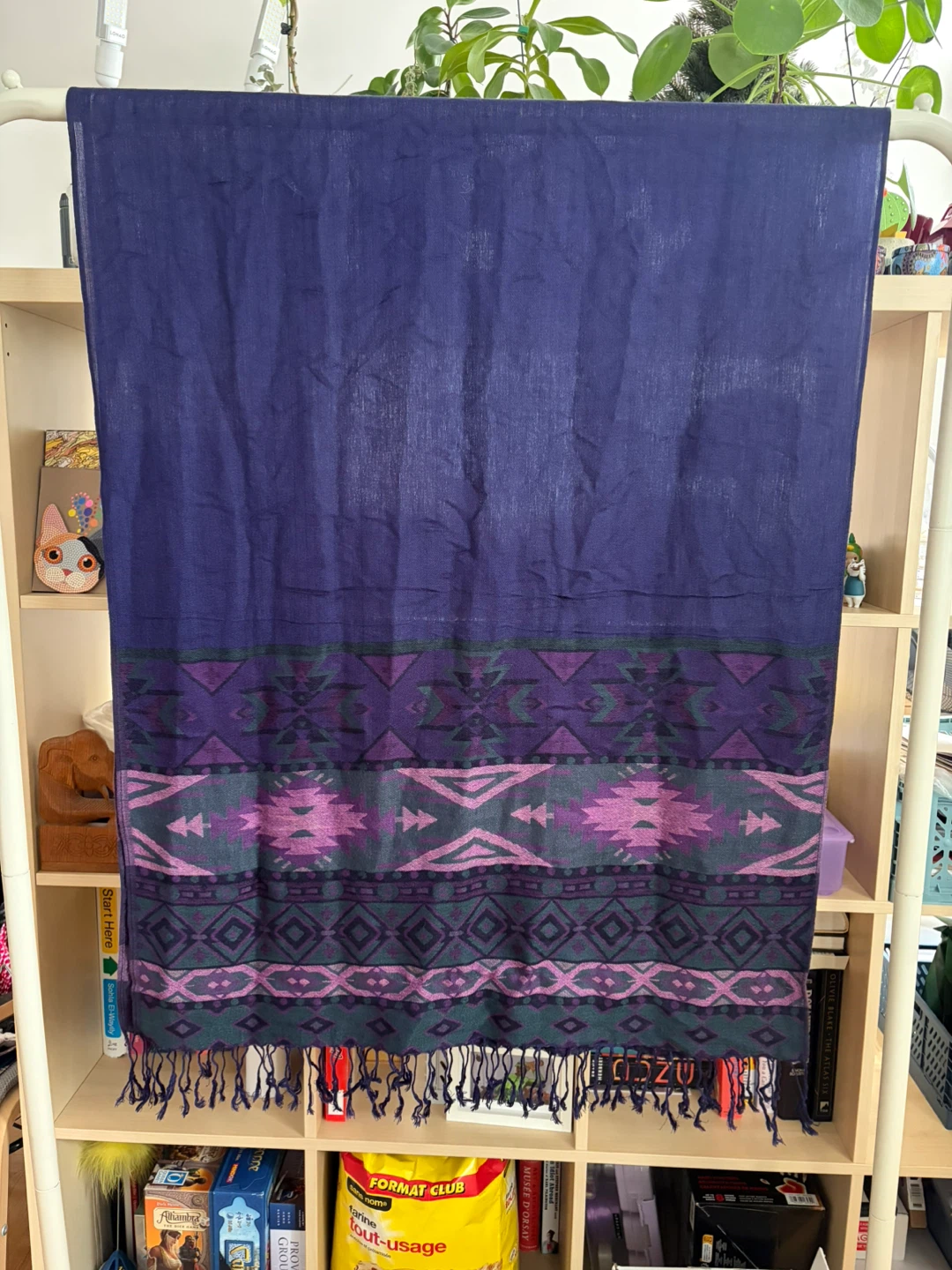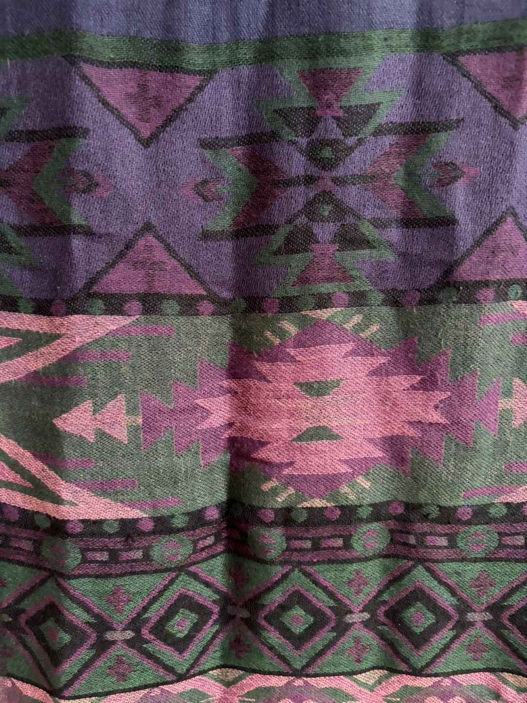Selling a scarf with a unique pattern in shades of purple and green. It's in great condition and would make a stylish addition to any outfit.