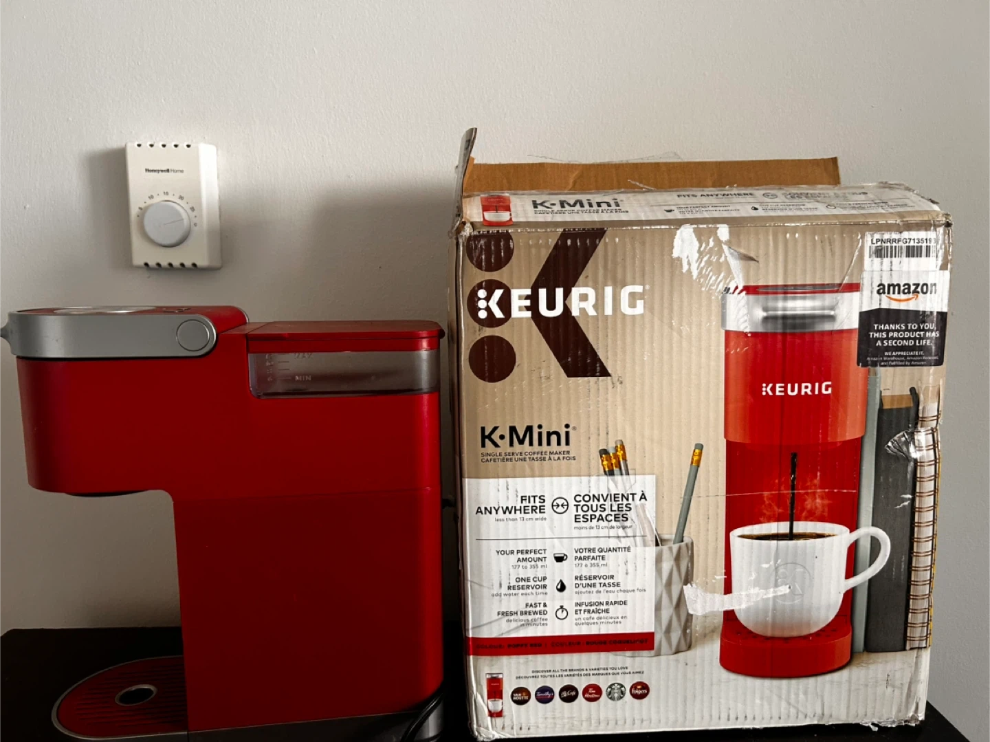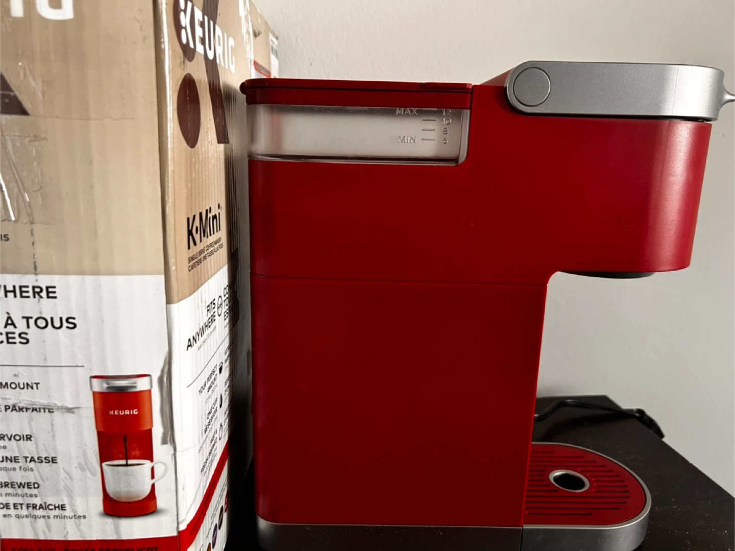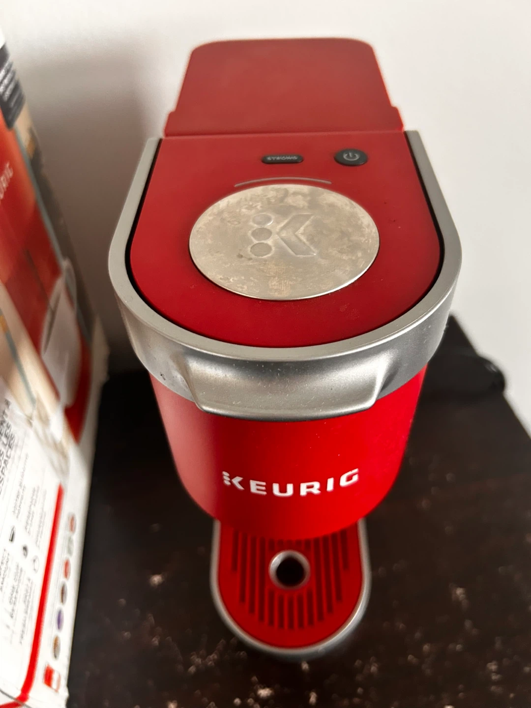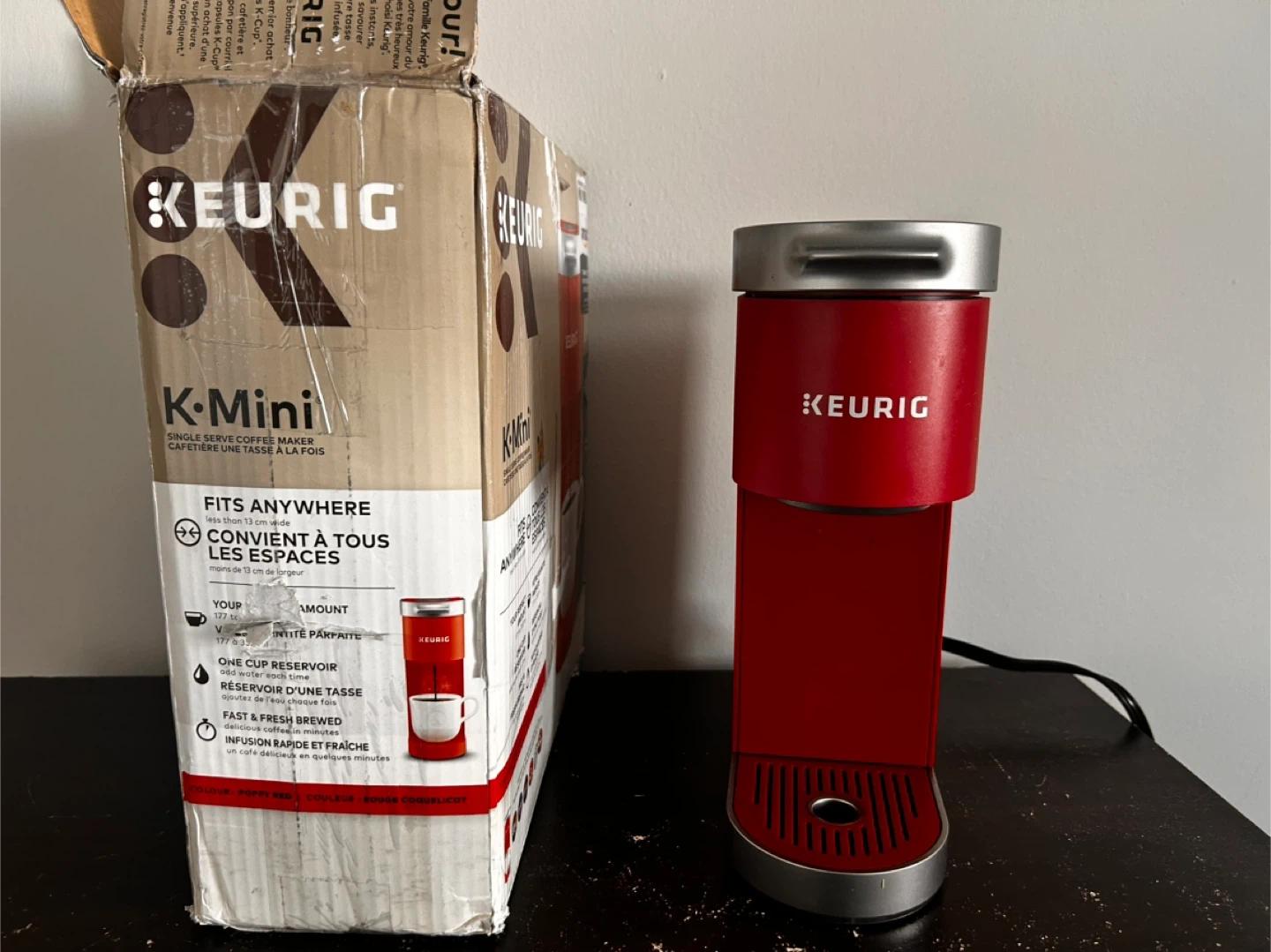 Open box Selling a Keurig K-Mini single serve coffee maker in Cardinal Red! It's in great condition and comes with the original box. This compact coffee maker fits anywhere and brews fresh coffee in minutes. Perfect for small spaces or anyone who wants a quick cup of coffee