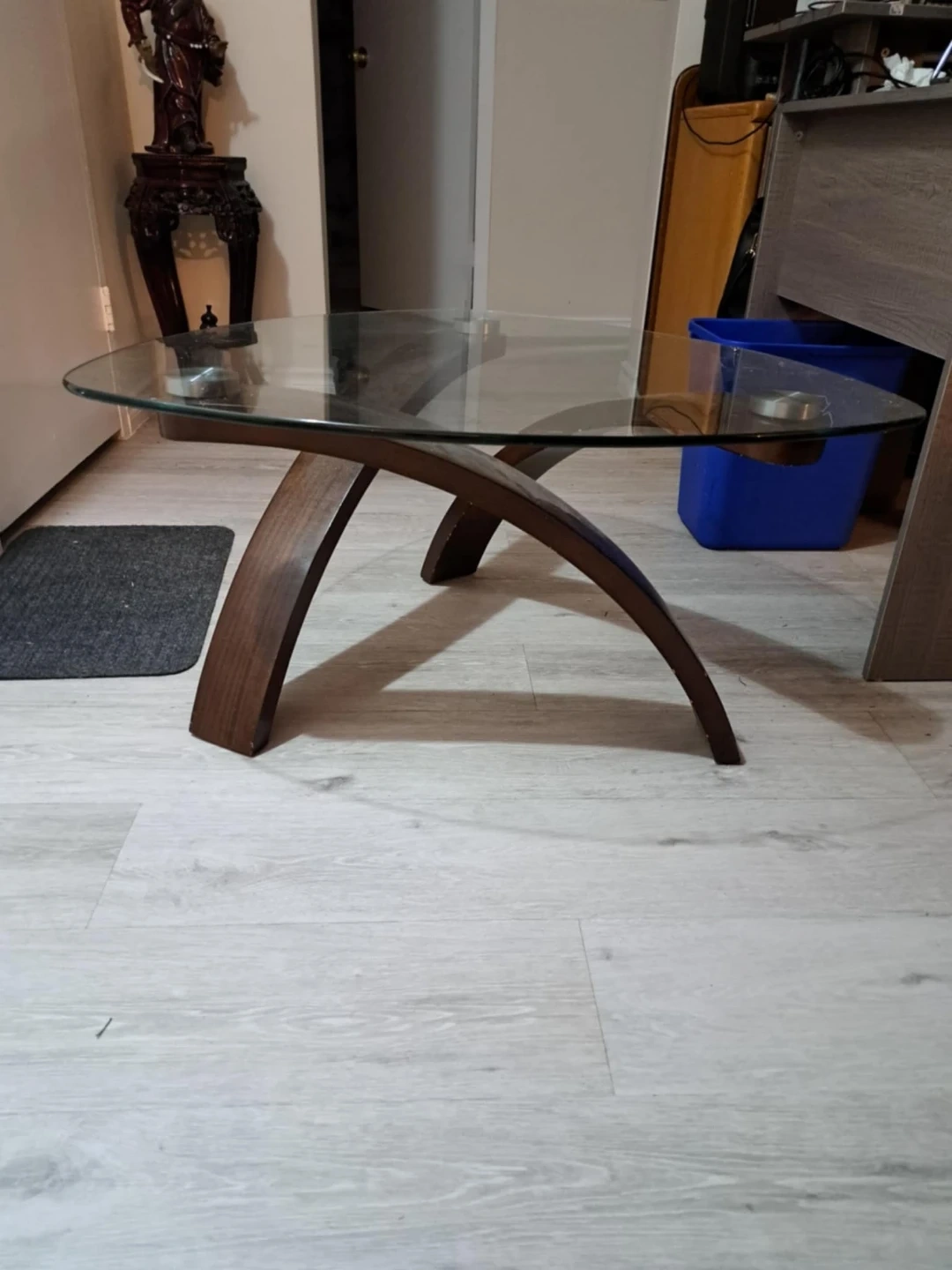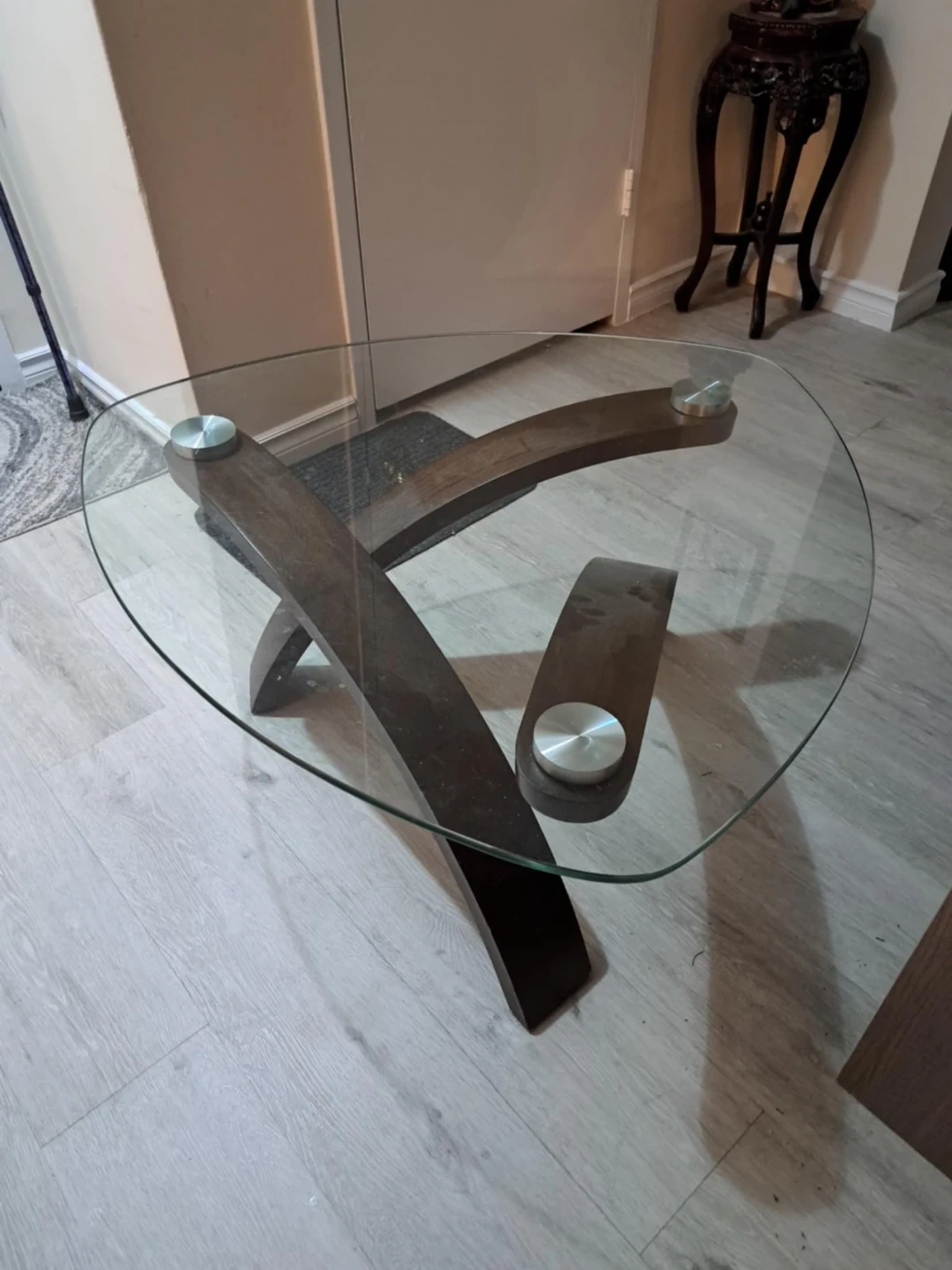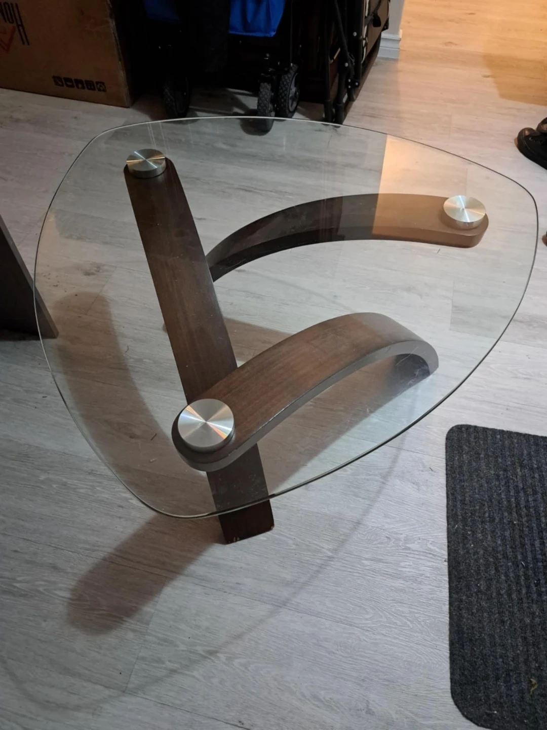 Selling a stylish coffee table featuring a glass top and a unique wooden base. It's in good condition and would be a lovely addition to any living room! The design is modern and eye-catching, perfect for adding a touch of elegance to your space.