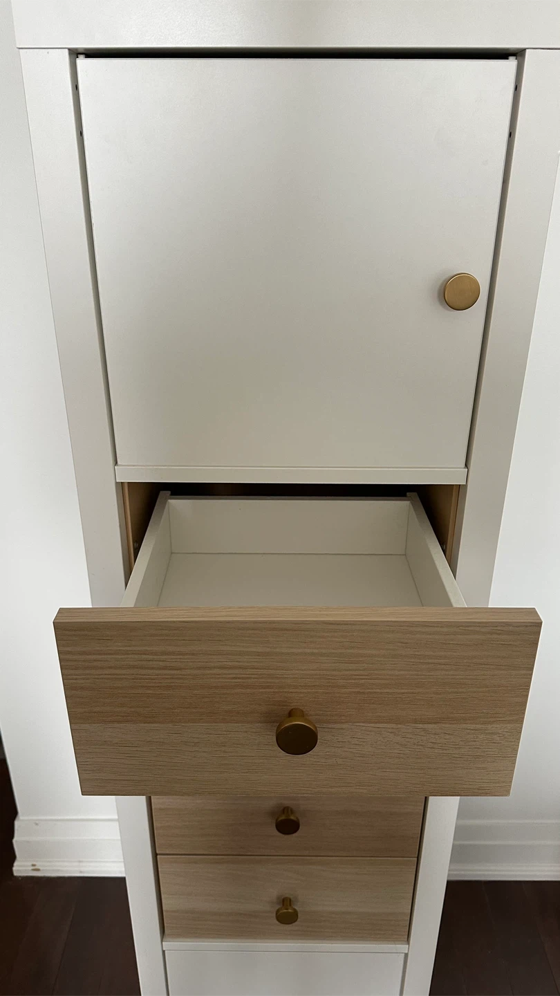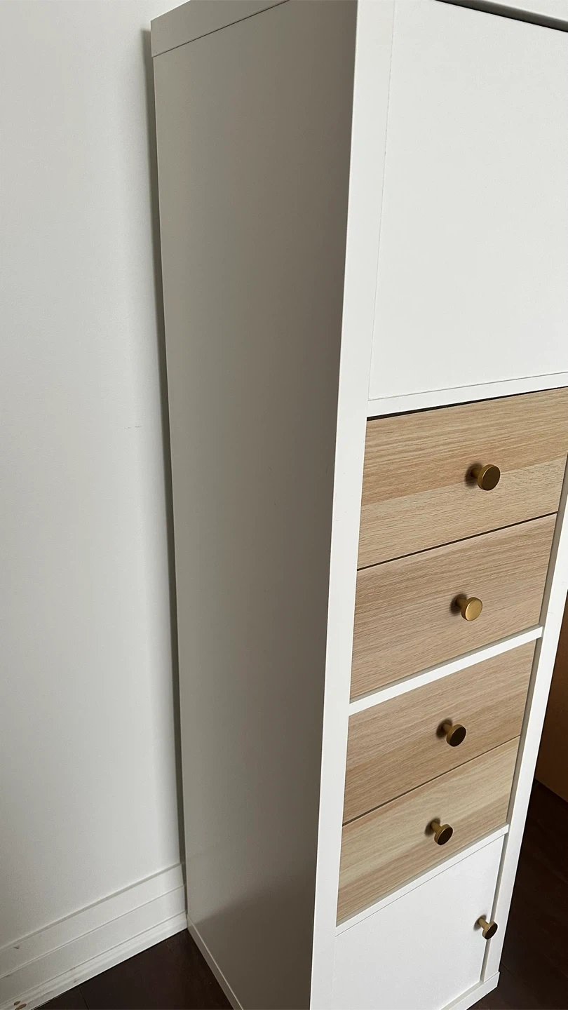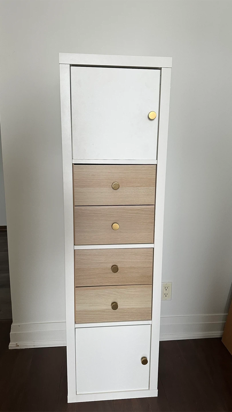 Selling an IKEA Kallax cabinet, perfect for adding some extra storage to any room! It features a mix of cabinet space and drawers, with cute gold knobs. The unit is white with wood-look drawer fronts.