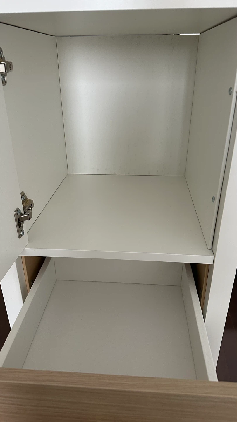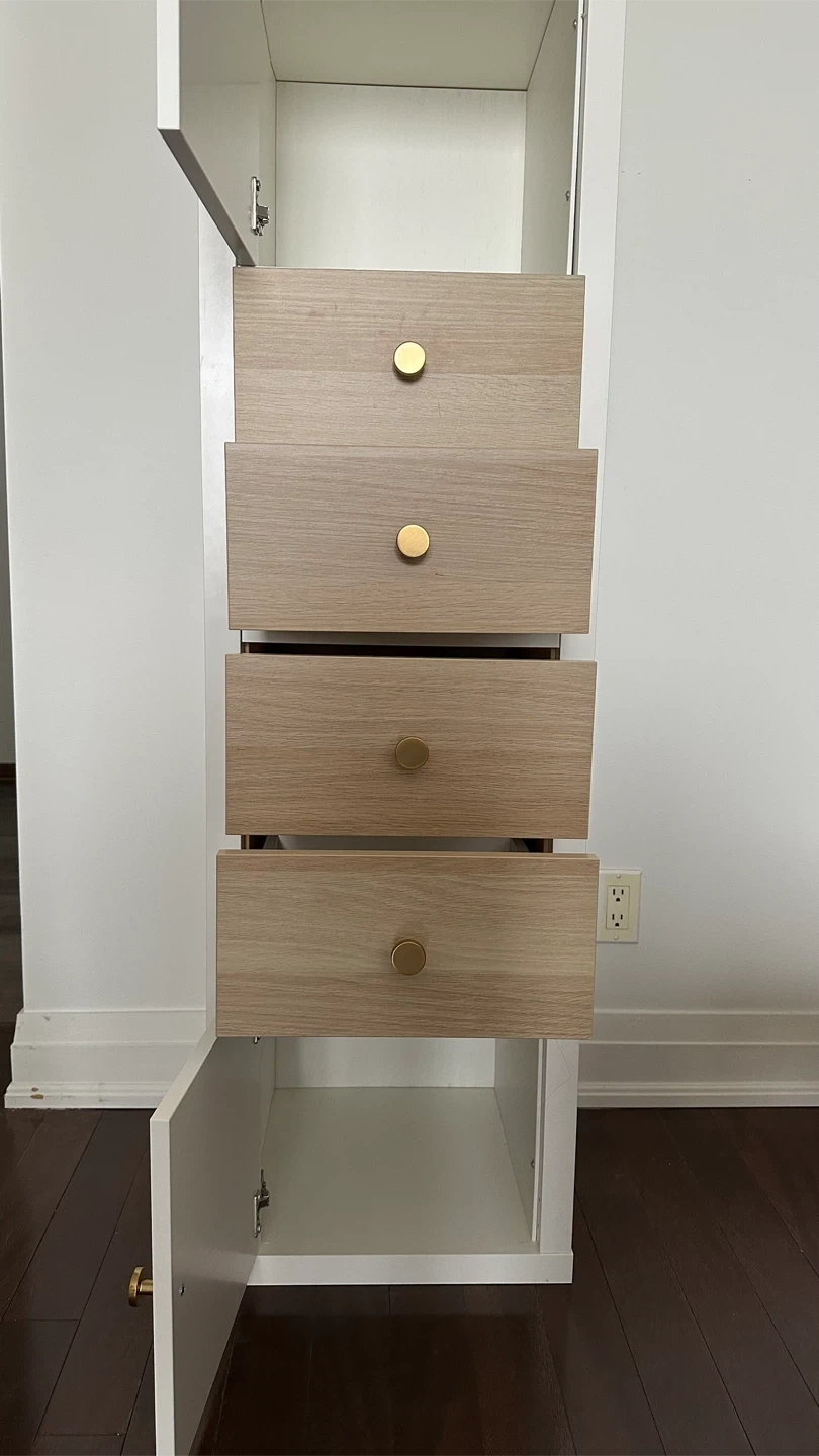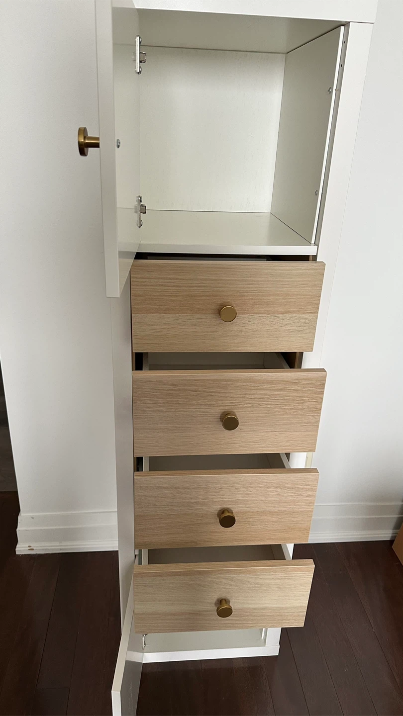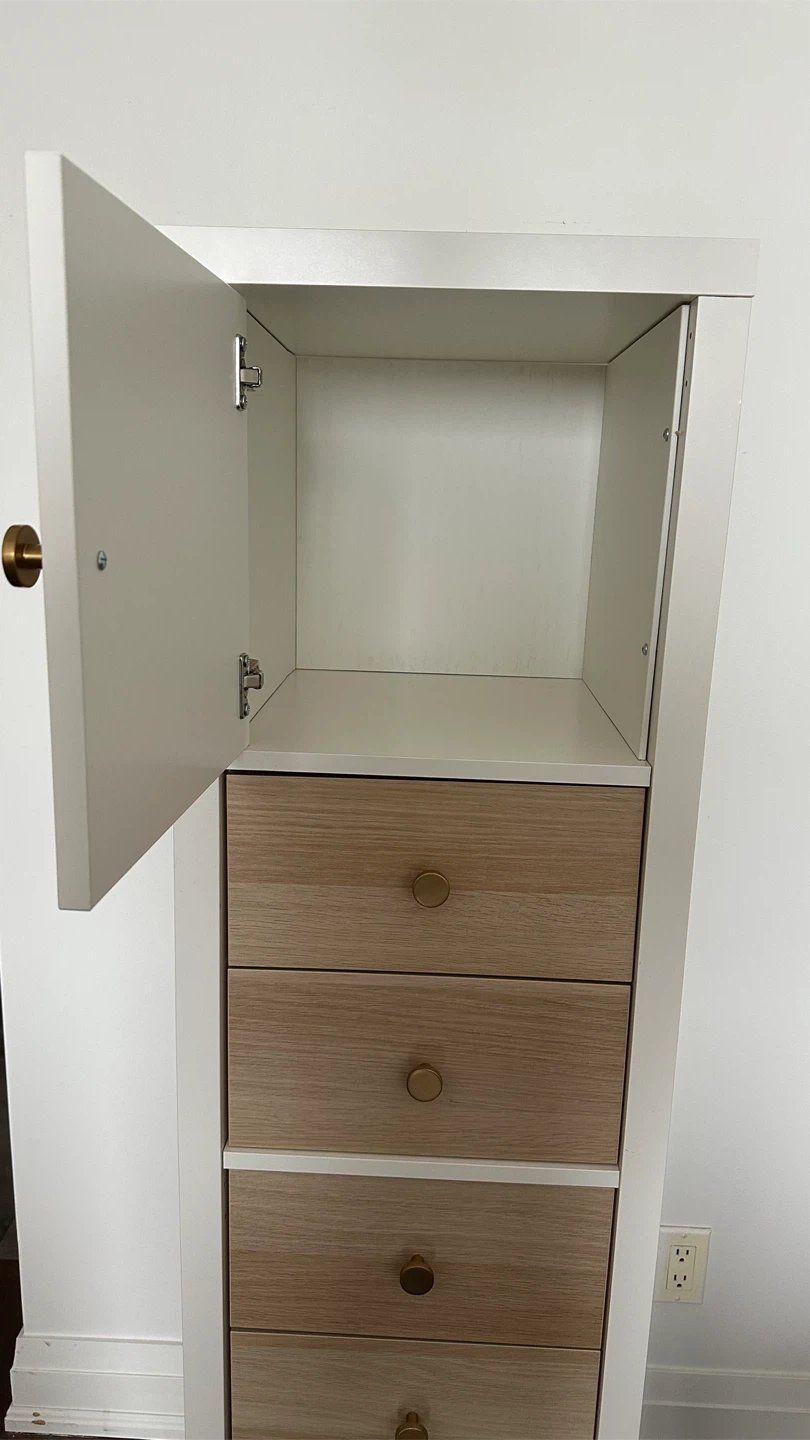 Selling an IKEA Kallax cabinet, perfect for adding some extra storage to any room! It features a mix of cabinet space and drawers, with cute gold knobs. The unit is white with wood-look drawer fronts.