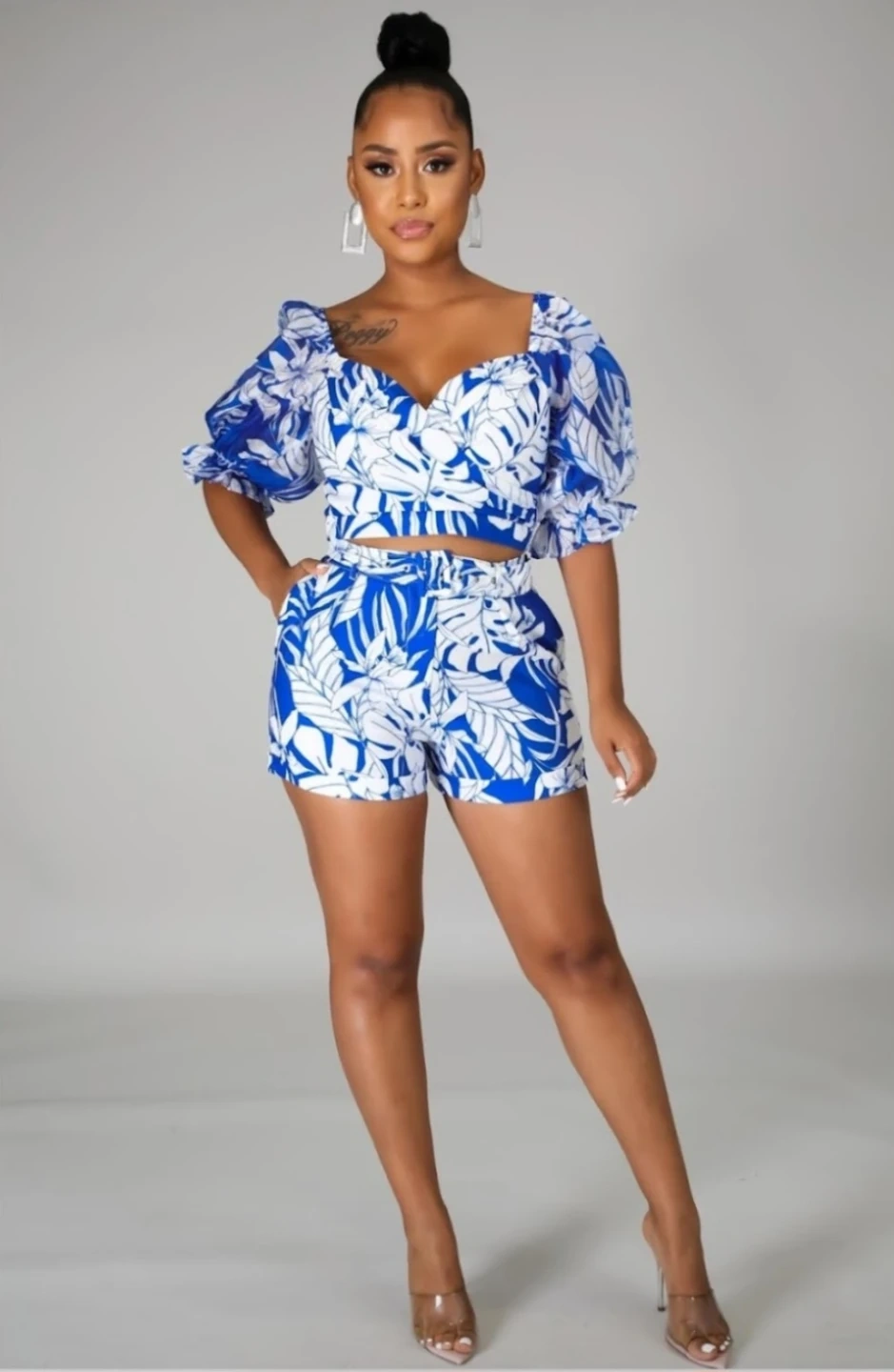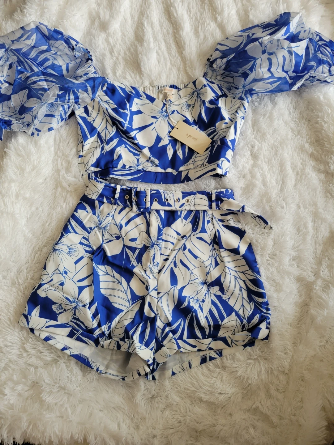 This is a super cute two-piece set from Apricot Lane! It features a blue and white floral pattern. The set includes a short-sleeved crop top and matching shorts, perfect for summer. It's a size small and in great condition