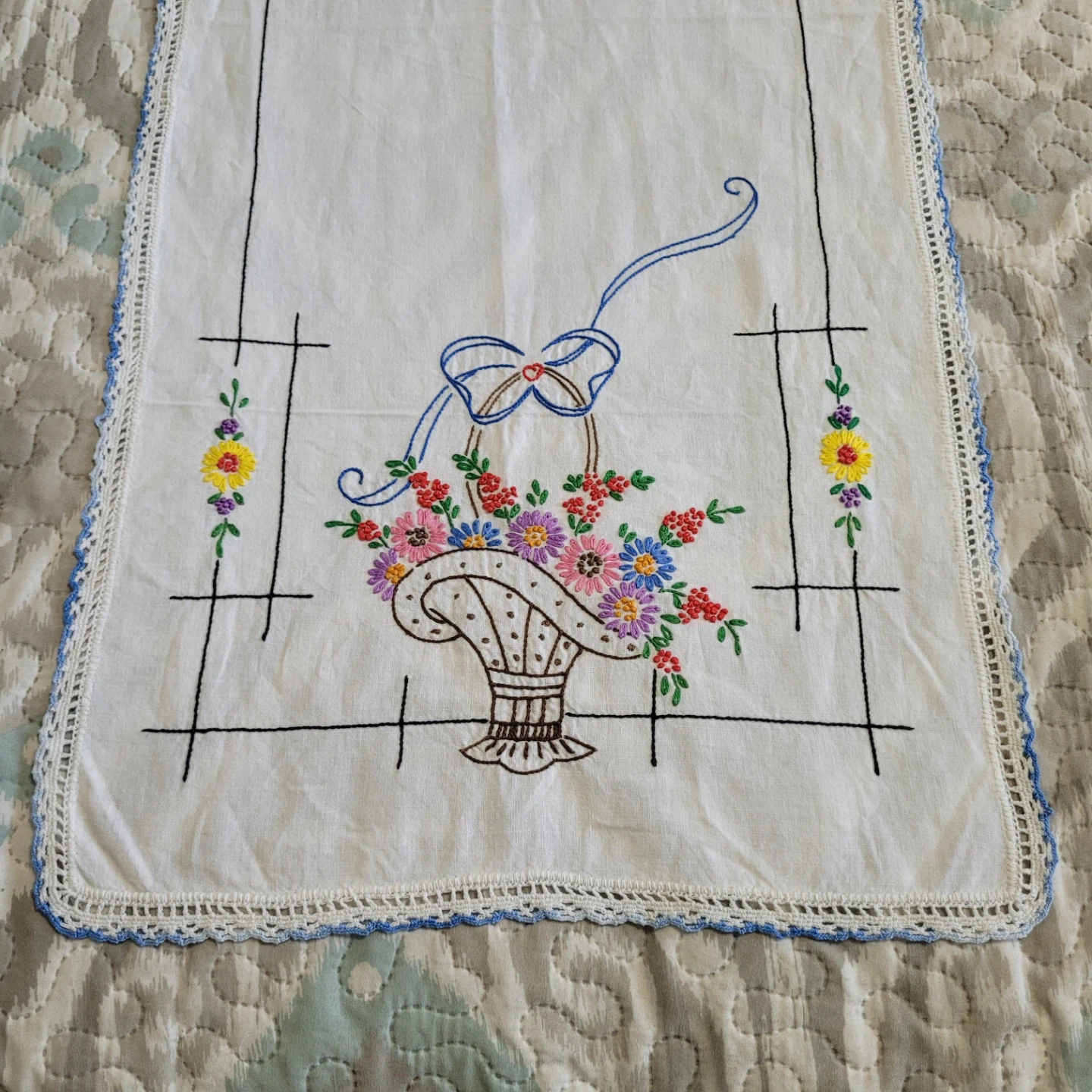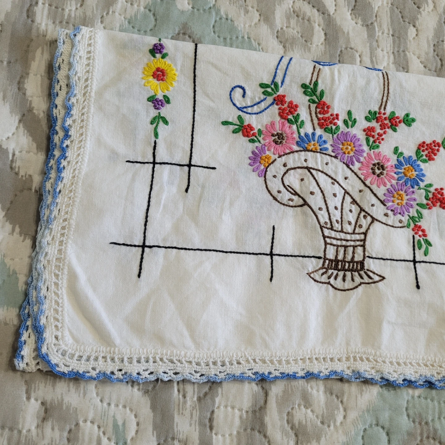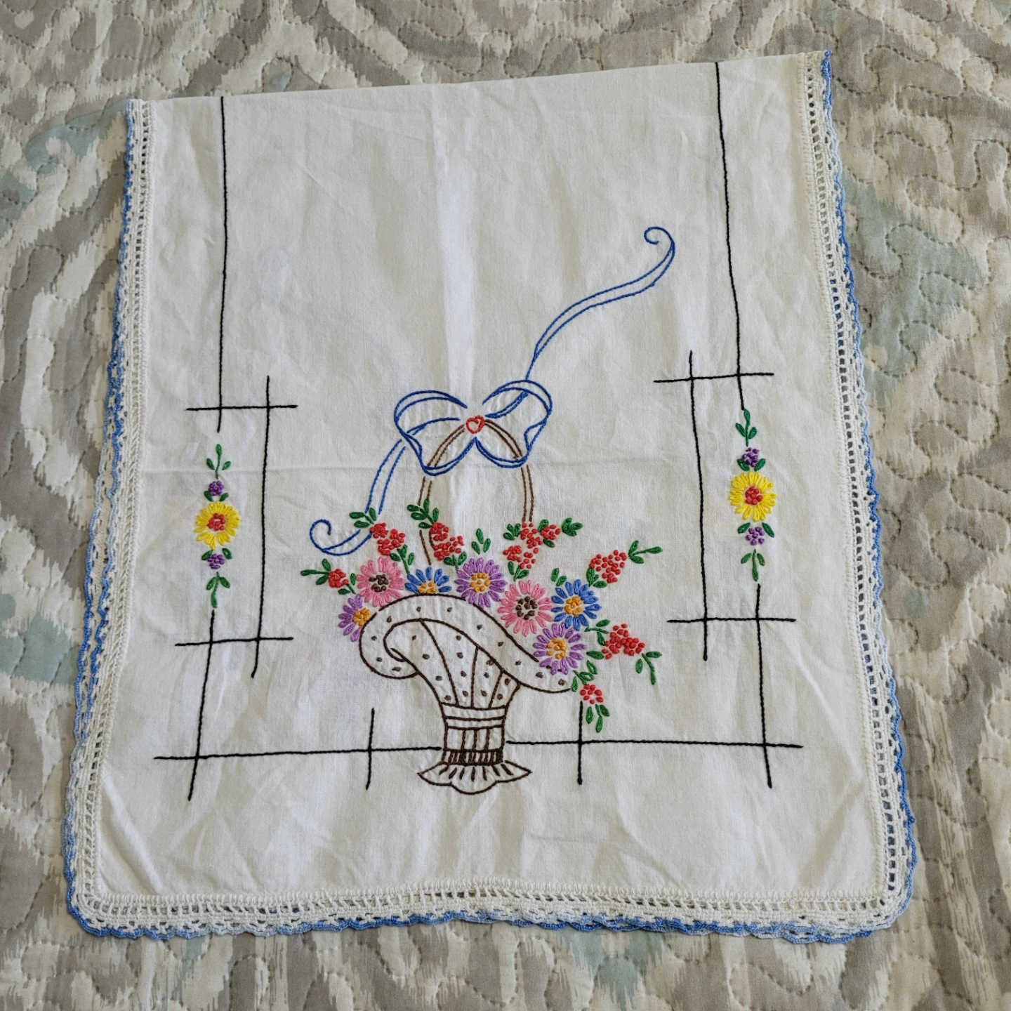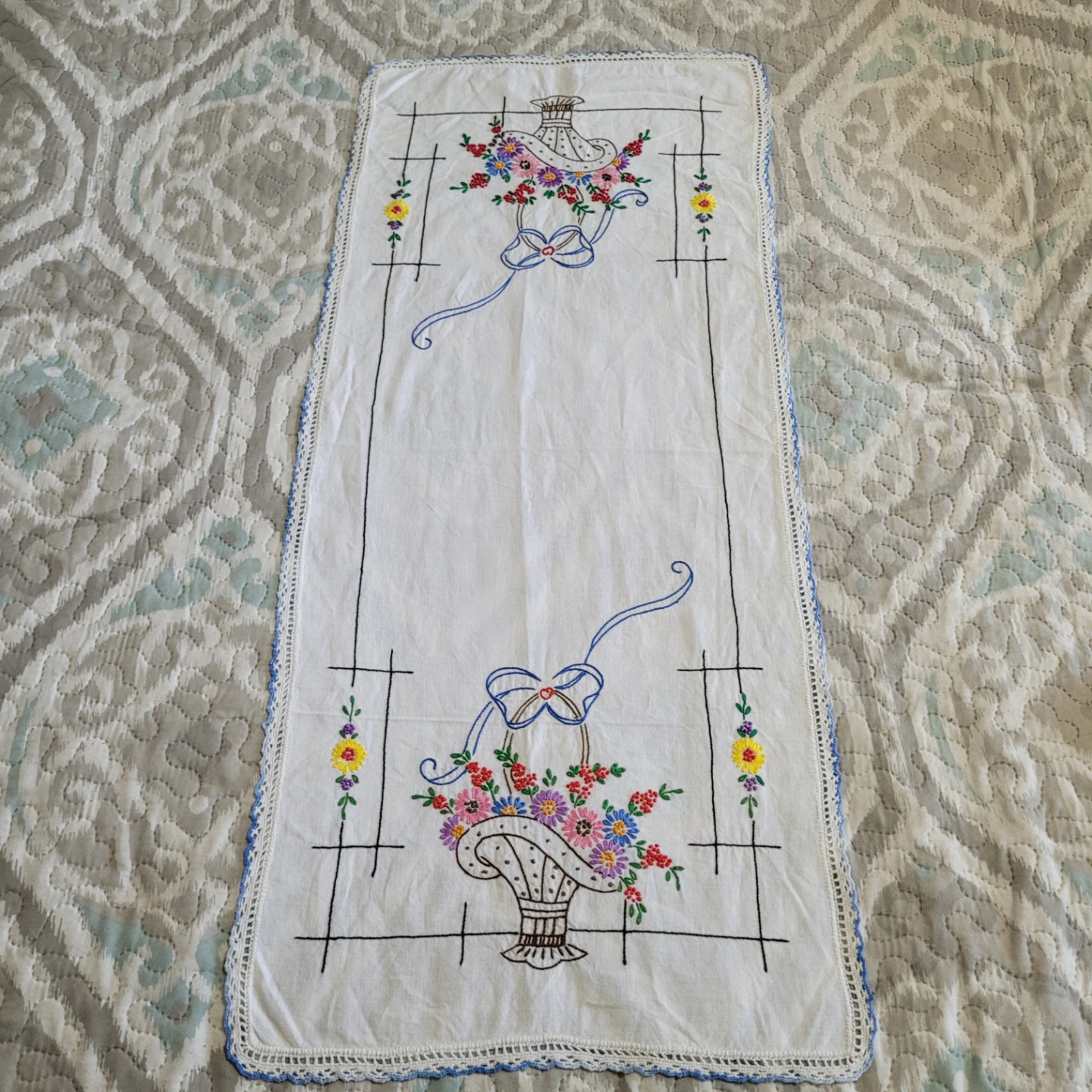 Beautiful Vintage 34" x 15" Cross Stich Linen Table Runner Decor with Basket of Flowers Excellent Condition please see all pictures