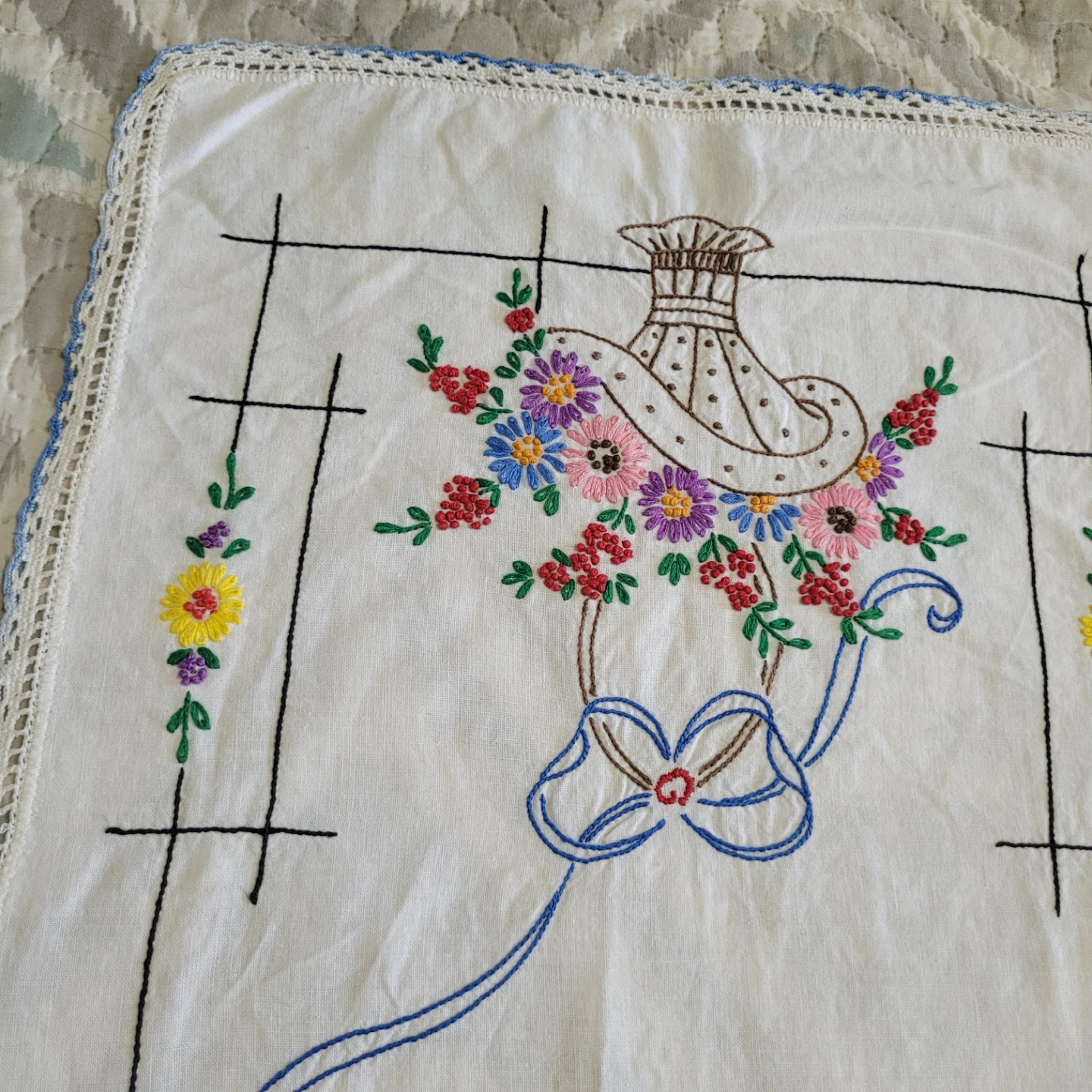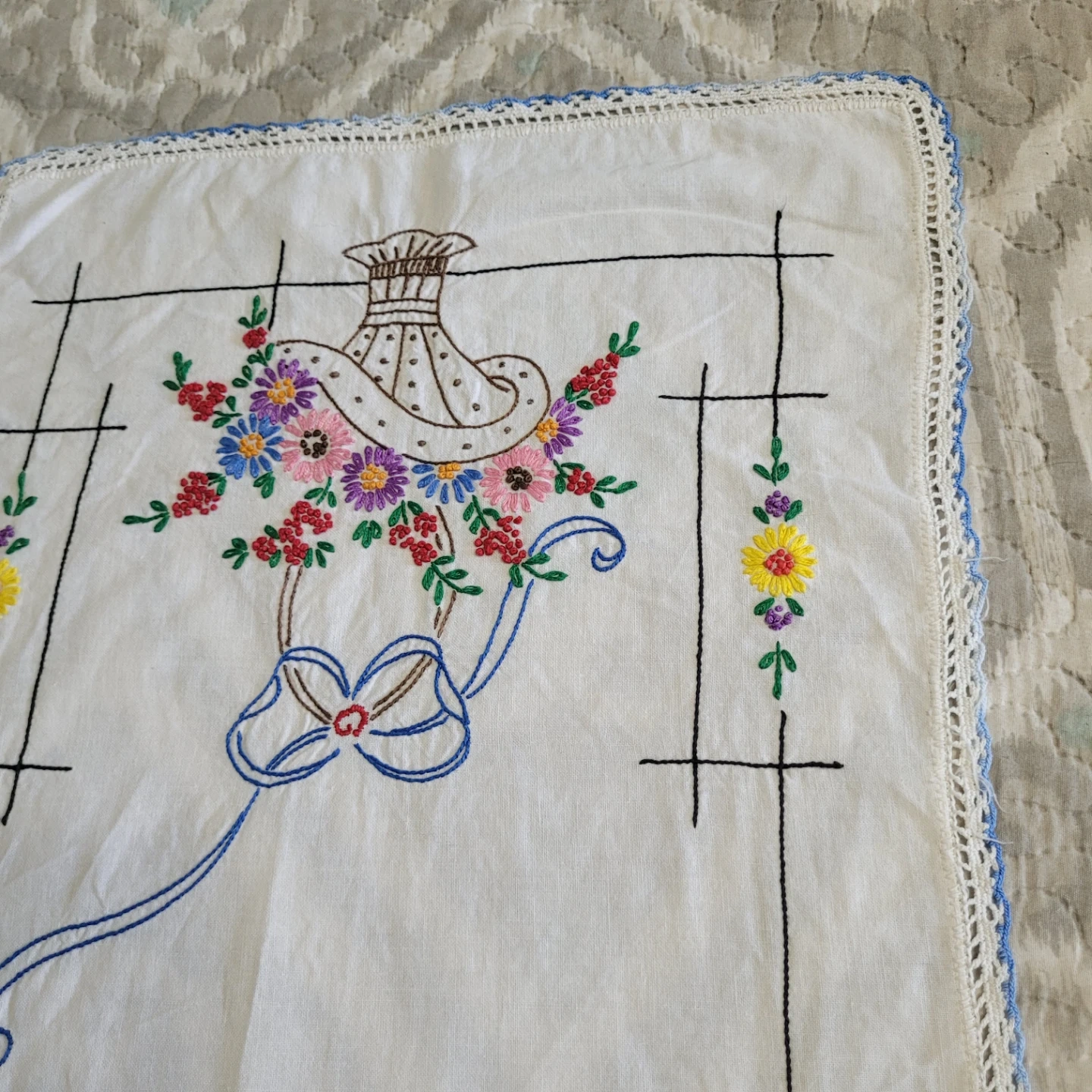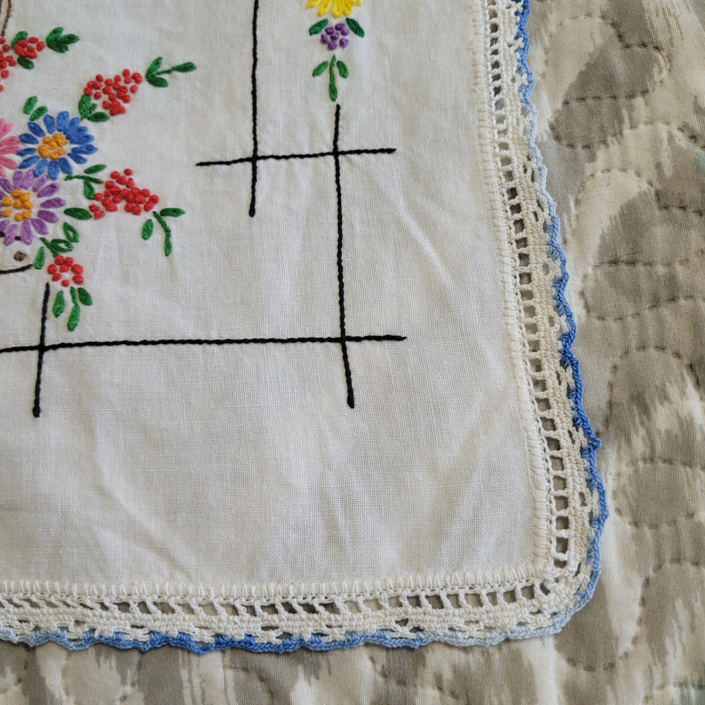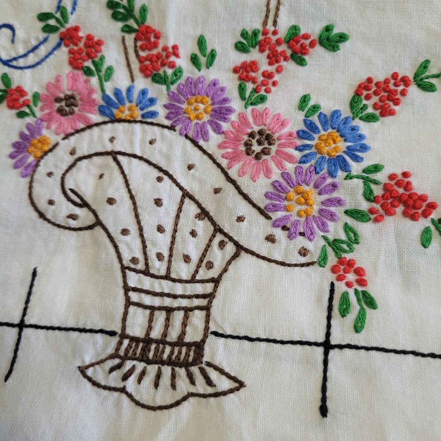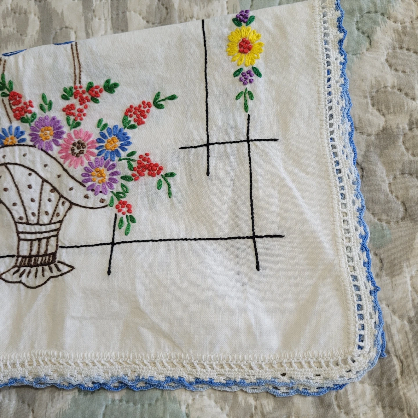 Beautiful Vintage 34" x 15" Cross Stich Linen Table Runner Decor with Basket of Flowers Excellent Condition please see all pictures