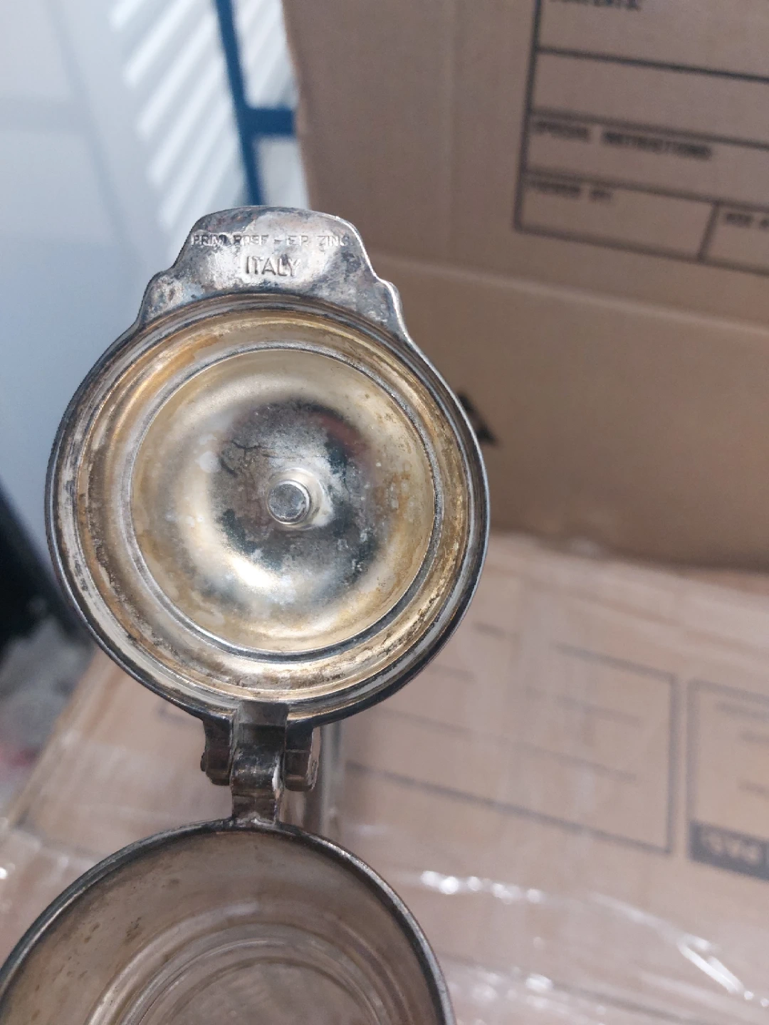 Selling a vintage pitcher marked PRIM SILVER EP ZINC ITALY. It's a charming piece with a silver-plated top and a textured glass body. Perfect for adding a touch of vintage elegance to your home!