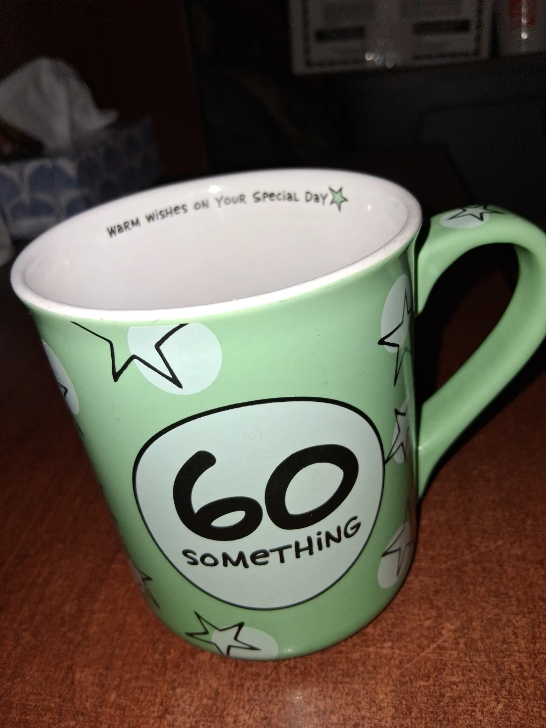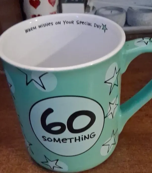 A cute mug perfect for someone turning 60 or already "60 Something"! It's a light green colour with white stars and the words "Warm Wishes on Your Special Day" written inside the rim