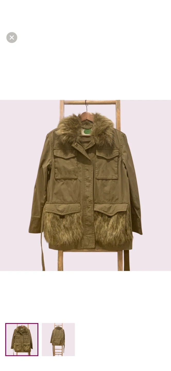 Here’s a stylish Anthropologie jacket in a lovely olive green colour! It features fur trim on the collar and pockets, adding a unique touch to this piece. It's in great condition and ready for a new home!