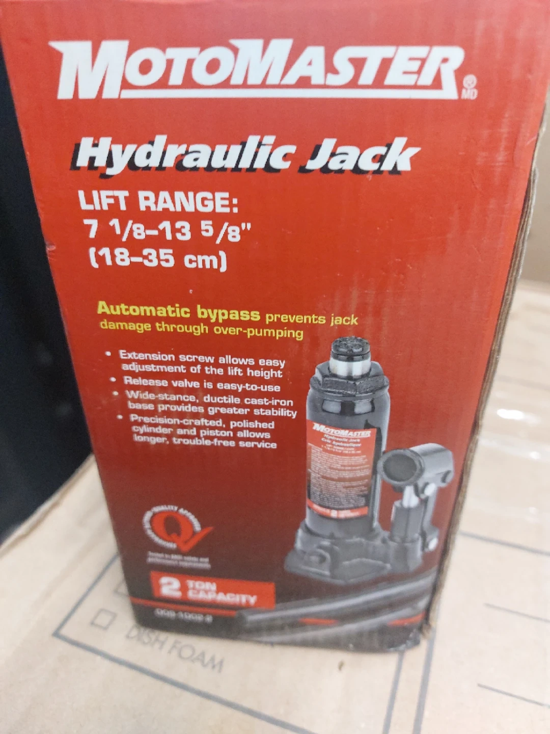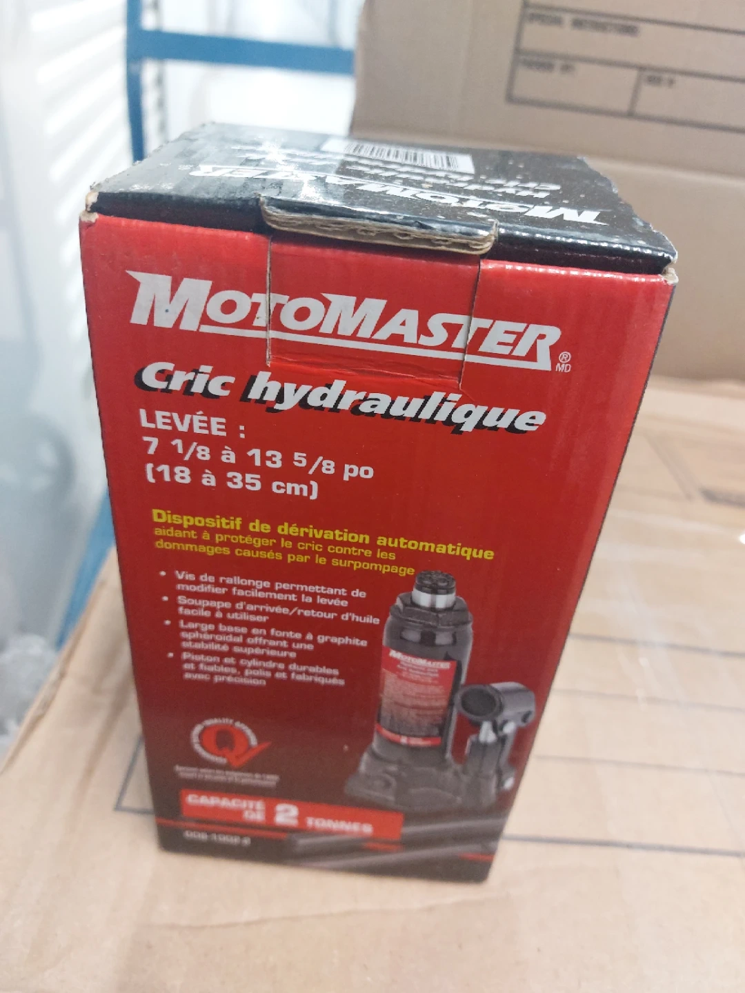 Selling a brand new MotoMaster 2-Ton Hydraulic Jack, still in its original box! The lift range is 7 1/8 - 13 5/8 inches (18-35 cm). It features an automatic bypass to prevent damage from over-pumping, and the extension screw allows easy adjustment of the jack height. The wide base provides greater stability, and the precision-crafted piston allows for longer, trouble-free service