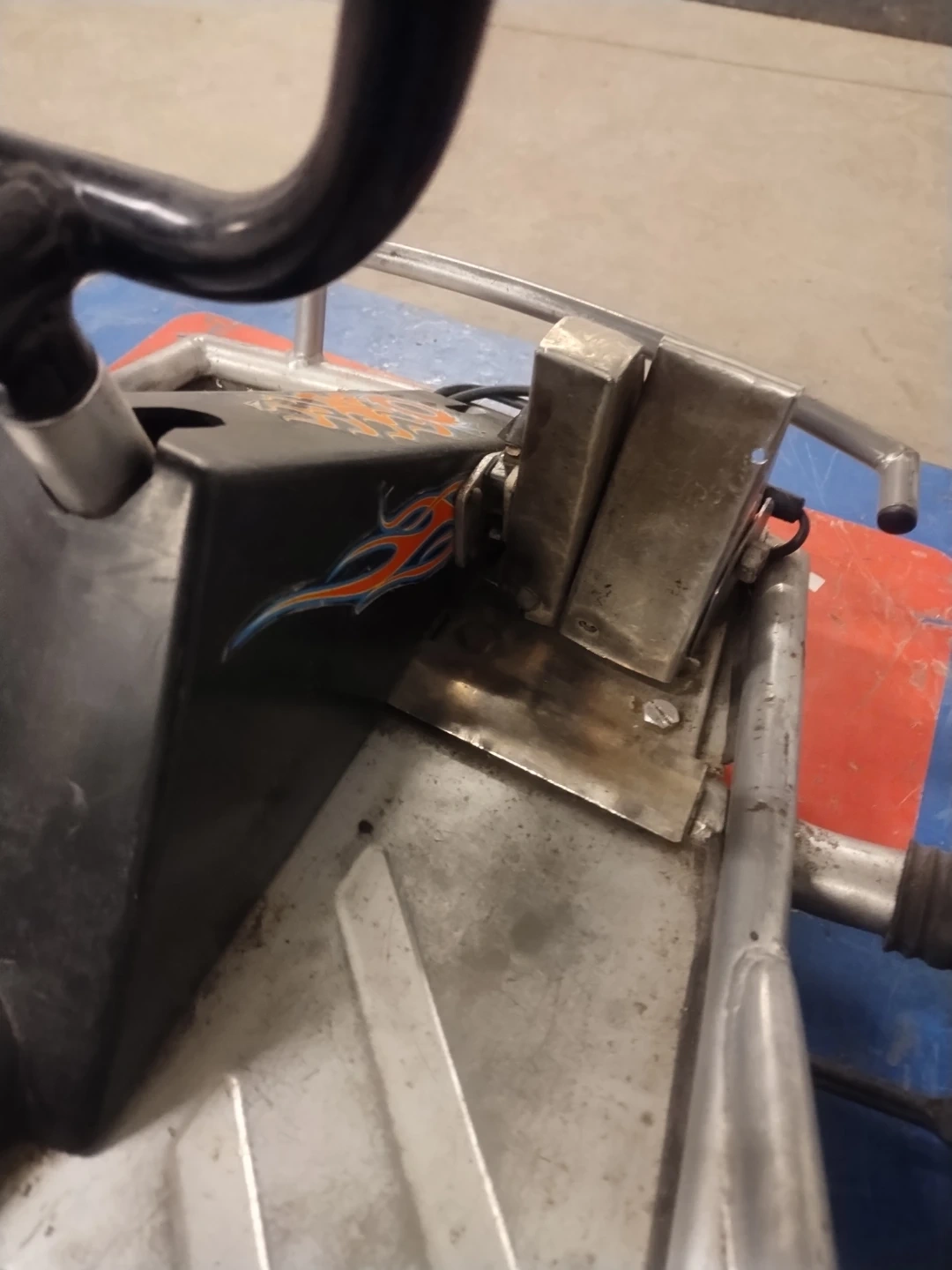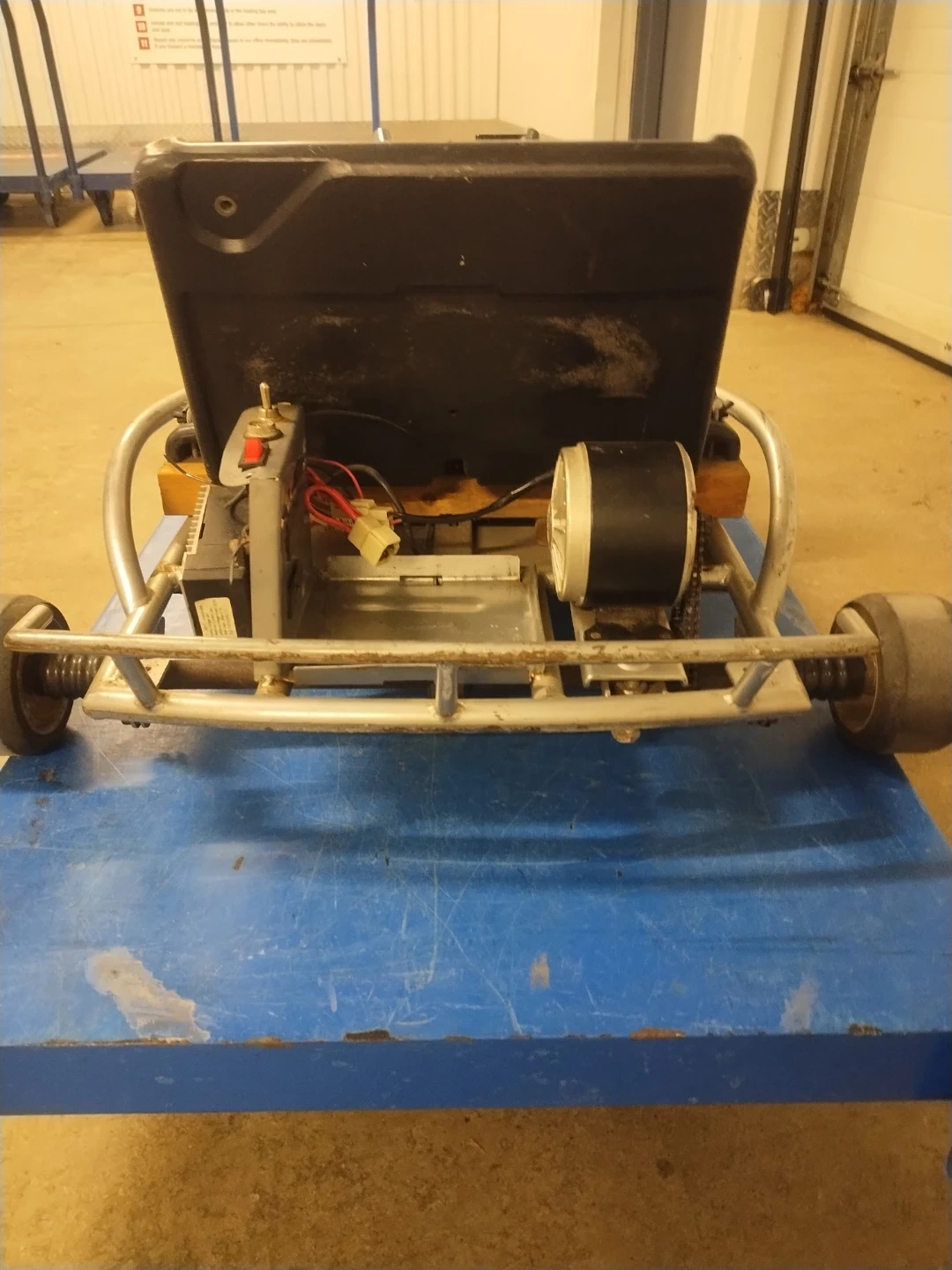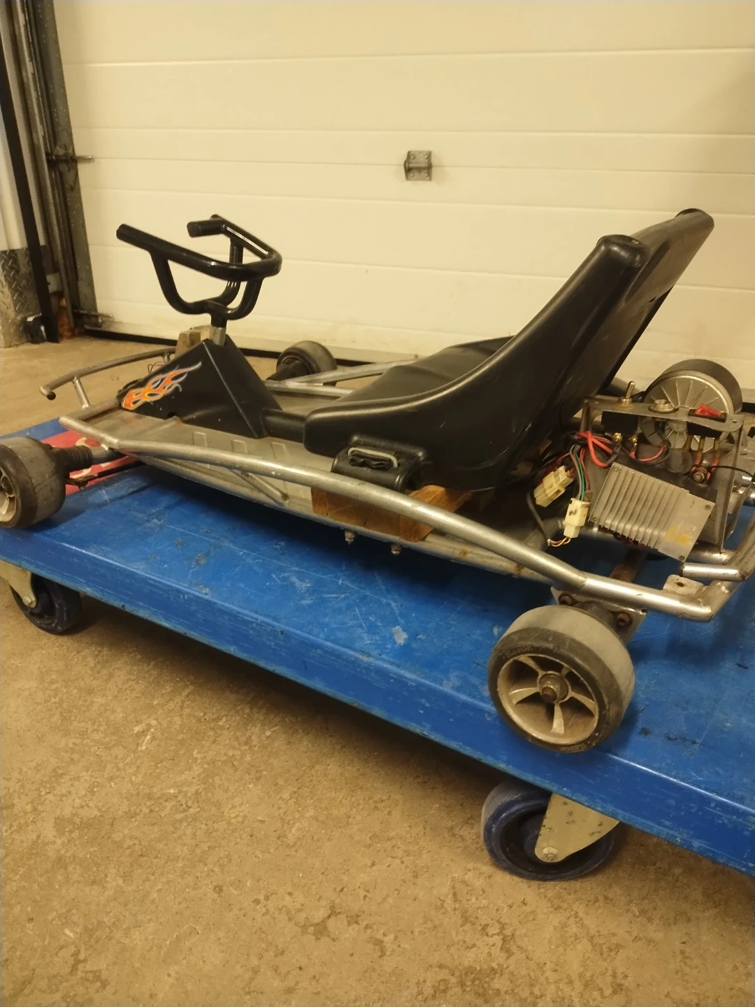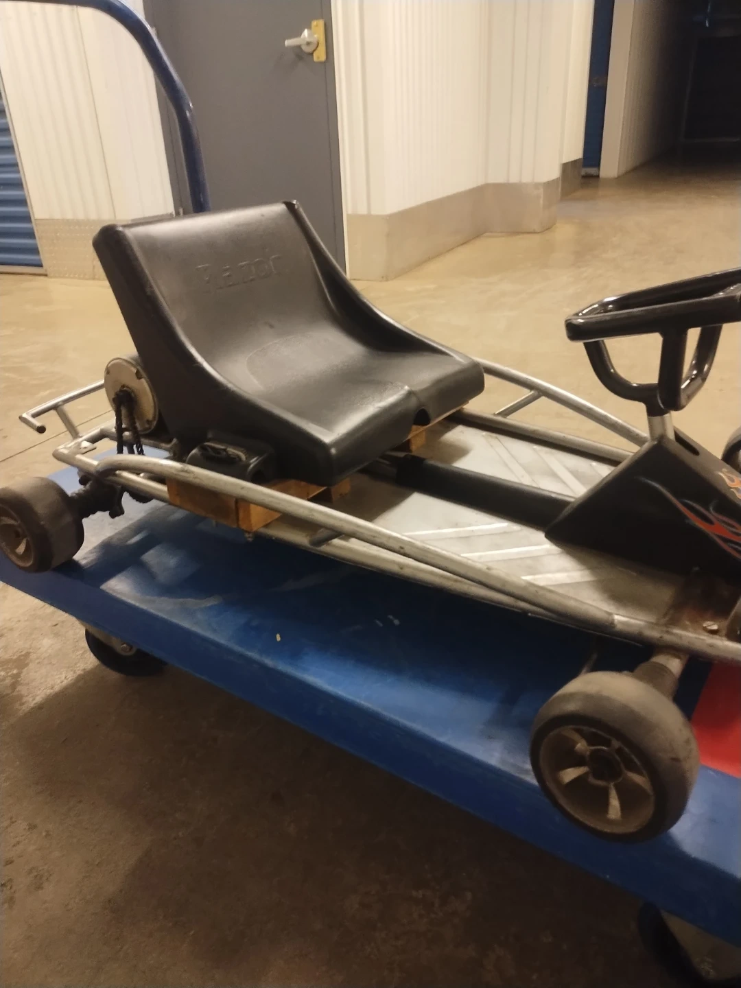 Selling a Razor Ground Force Drifter go-kart. It has a black seat and a flame design on the front. It shows signs of use but is still fun to ride!