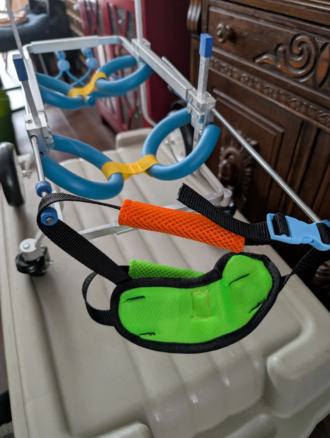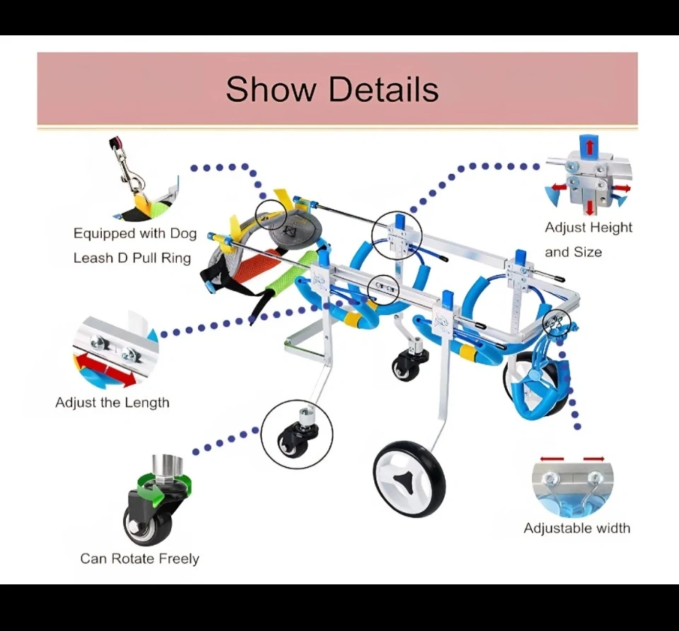 This adjustable pet wheelchair is designed to help dogs and cats with mobility issues. It features: