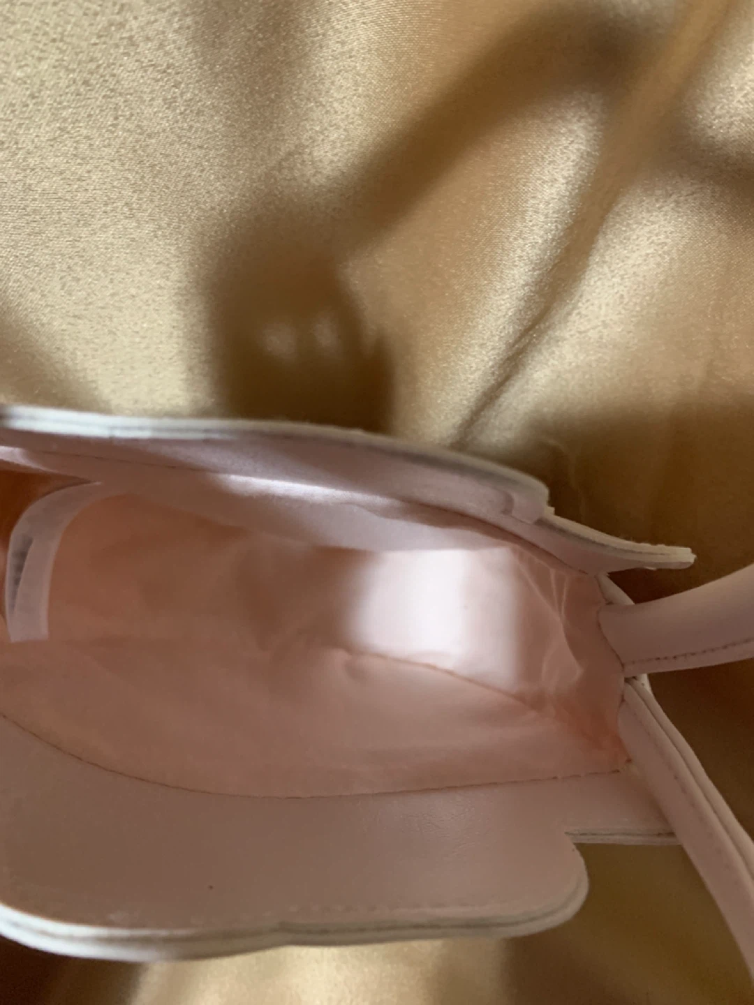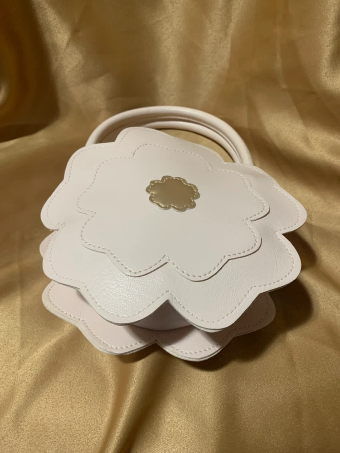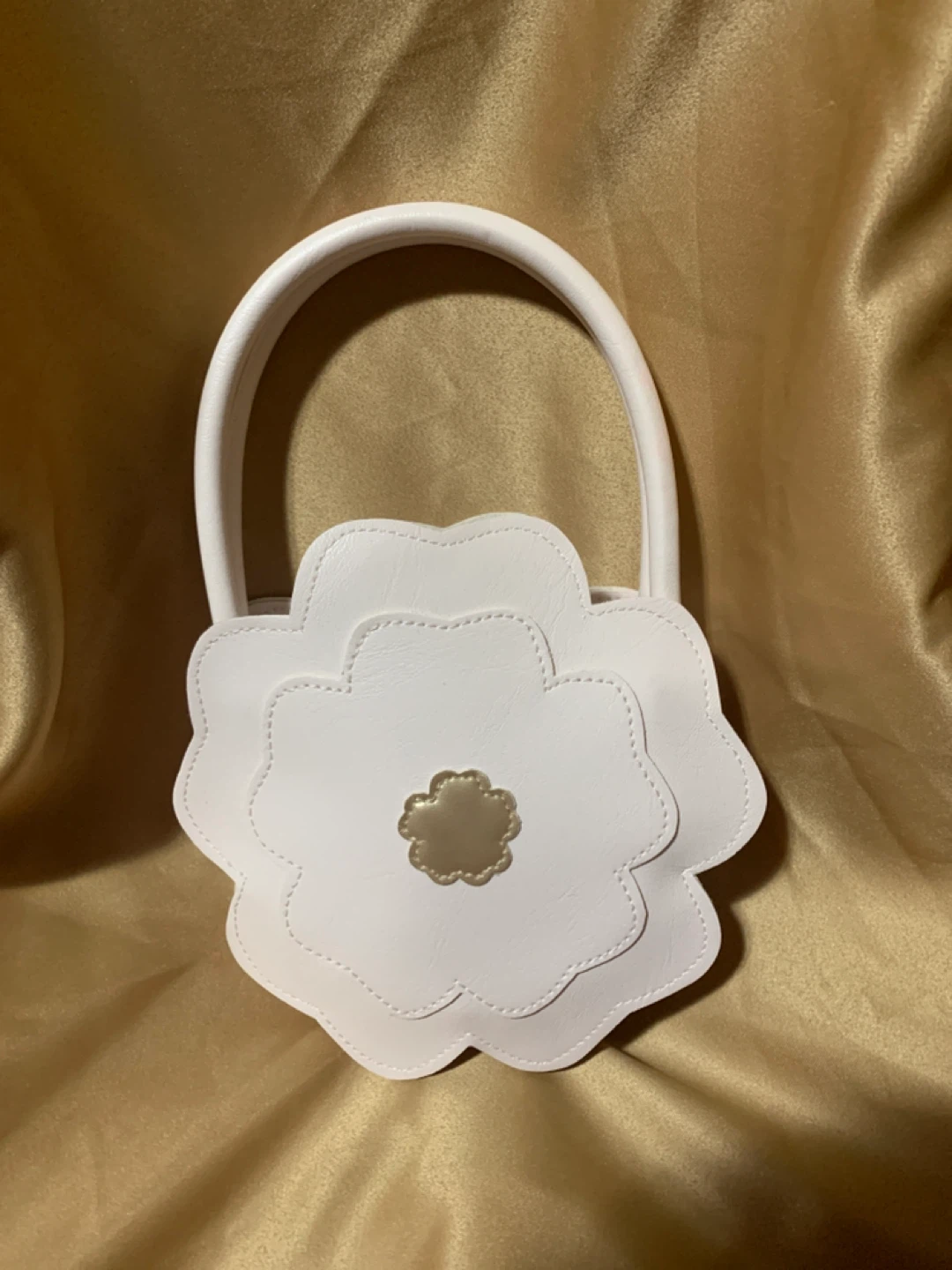 Selling a cute flower-shaped handbag! It's white with a gold centre and has a handle for easy carrying. The inside is lined with a light pink fabric. Perfect for adding a touch of whimsy to your outfit!