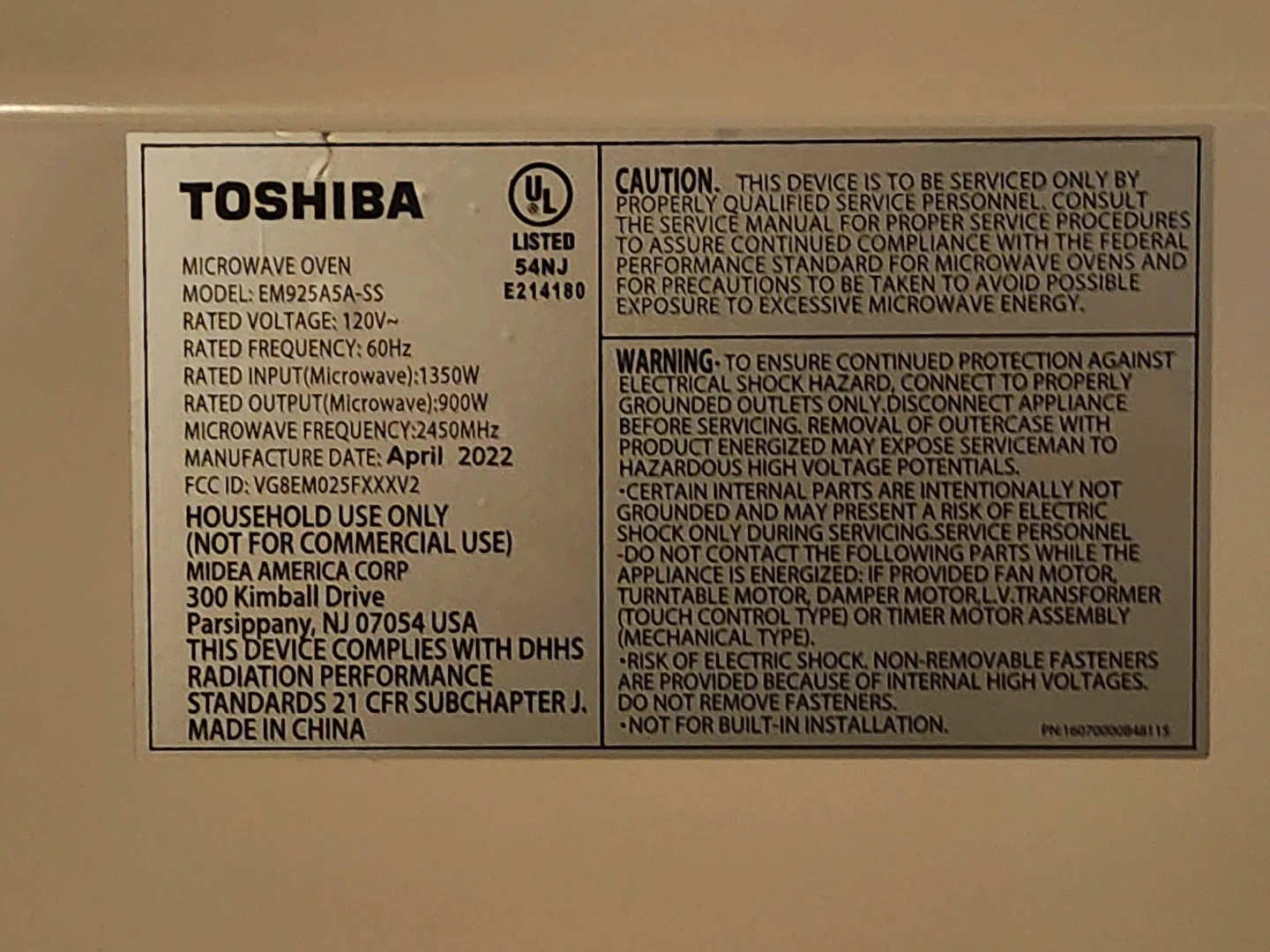 Selling a Toshiba microwave oven, model EM925ASA-SS. It's in good working condition. The glass plate that goes inside of the microwave comes with it as well. If it's posted, it's still available. Pickup only! I won't ship and though I will accept cashless payment, I'll only do so if e-transfered. I won't click on links in texts or emails.