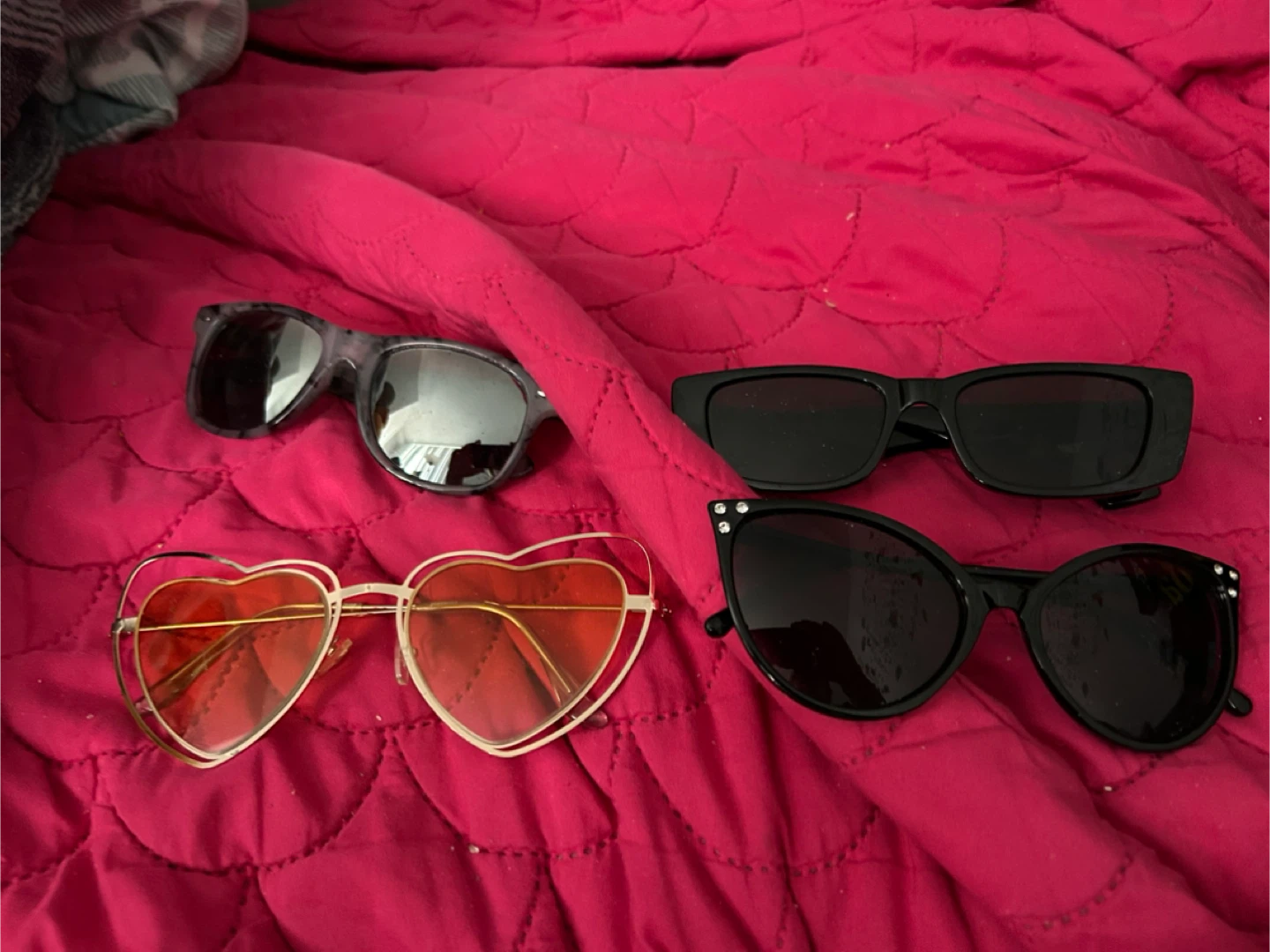 Selling four pairs of sunglasses. There's a variety of styles, including heart-shaped and classic black frames. All in great condition and ready for sunny days!