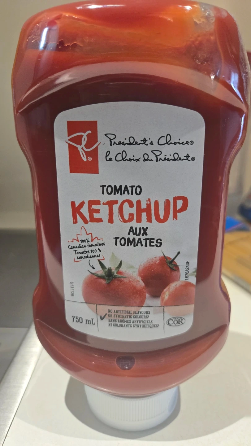 Selling a bottle of President's Choice Tomato Ketchup! It's a 750 mL bottle made with 100% Canadian tomatoes and has no artificial flavours or synthetic colours. Perfect for your next BBQ or snack time!