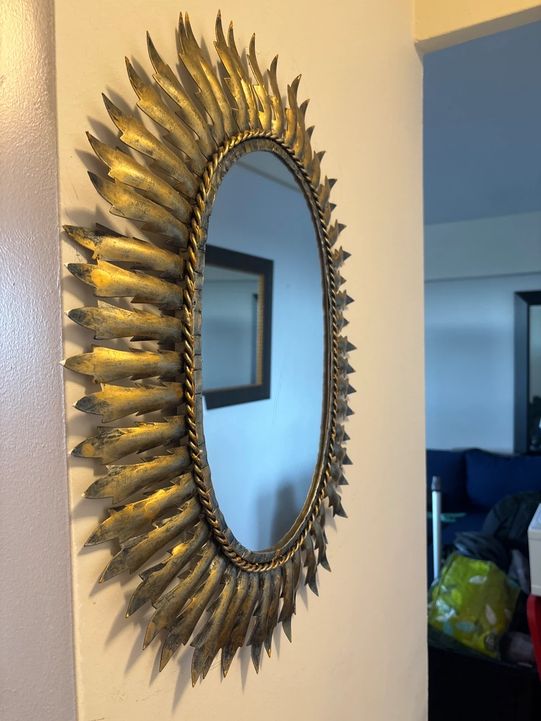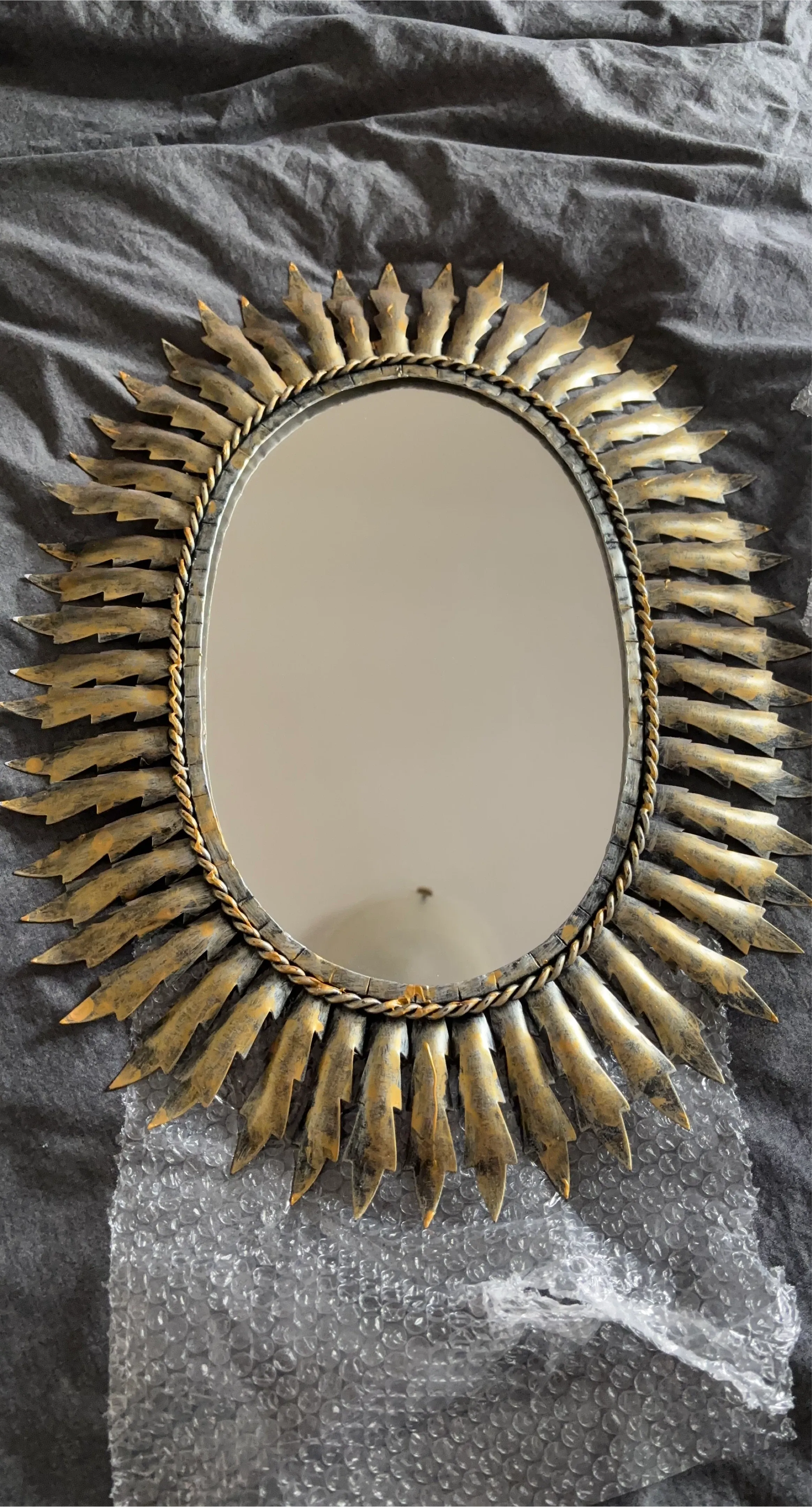 Selling a lovely gold sunburst mirror! It's in pretty good condition and would look amazing in any room. The mirror has a unique design with a braided rope detail around the oval mirror. Design inspired from items you’d find in a castle.