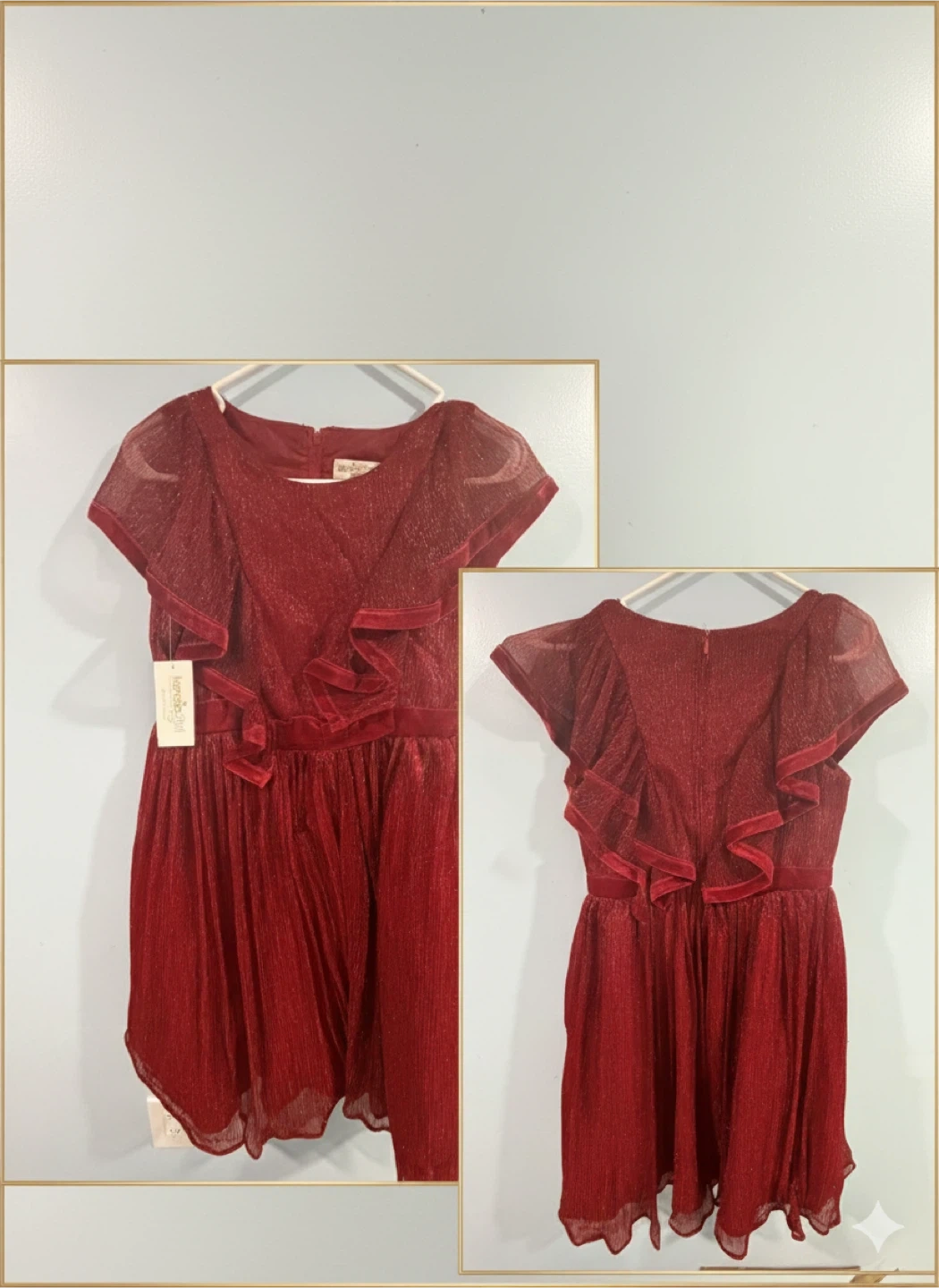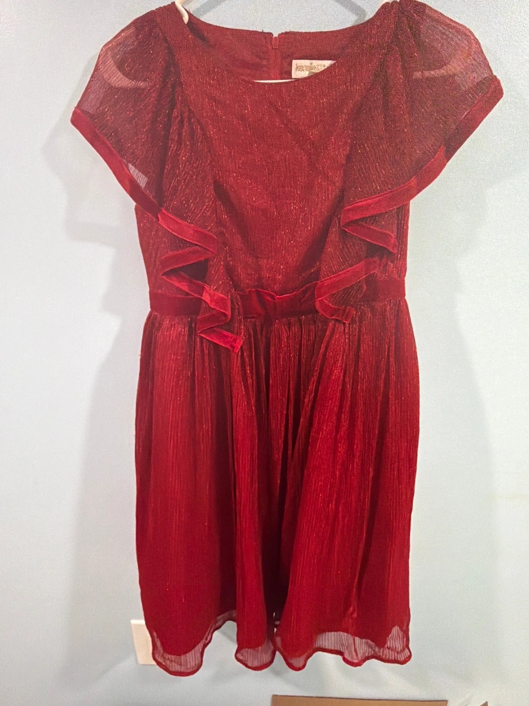 This is a beautiful red dress from Speechless for girls. It features a unique design with ruffles and a shimmering texture. It's perfect for parties or special occasions!
