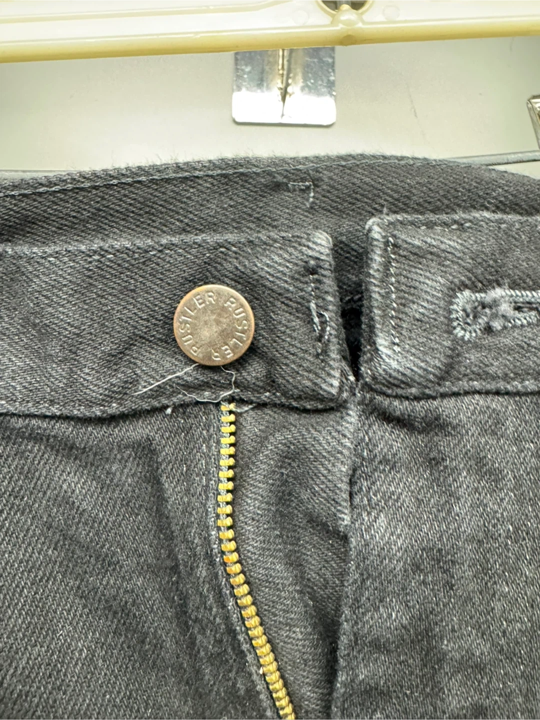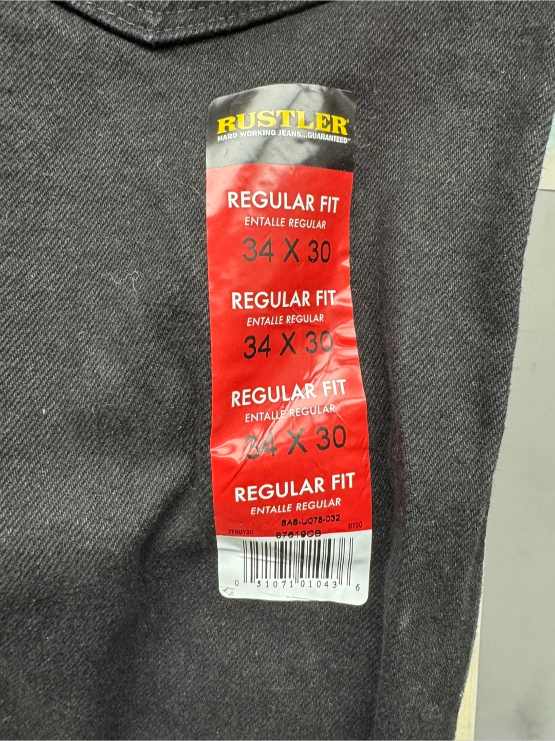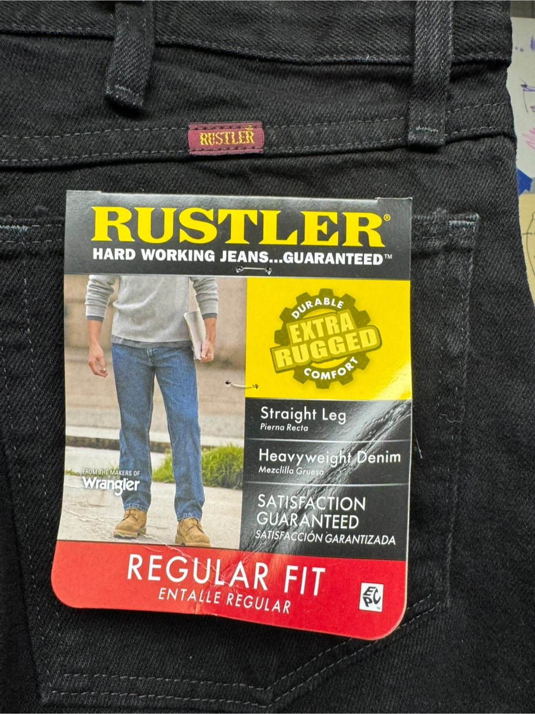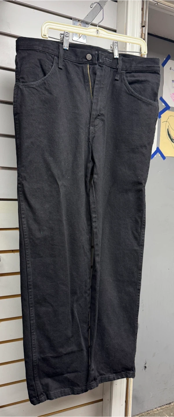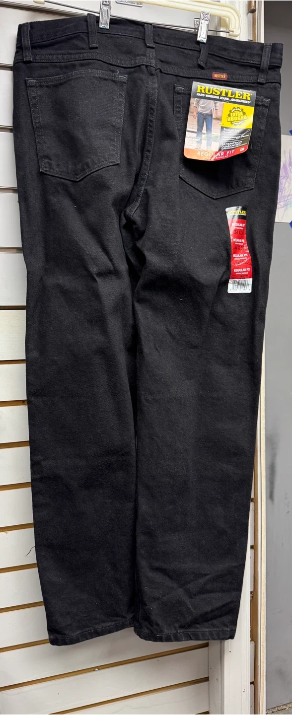Here are some Rustler Regular Fit Jeans in size 34x30. They are black and made of heavyweight denim. These jeans are durable and extra rugged for comfort!