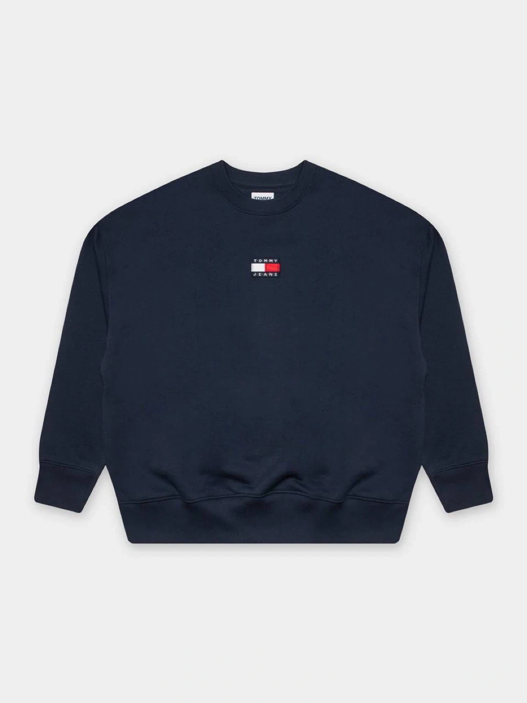 Navy blue Tommy Jeans crewneck sweatshirt. Features a small Tommy Jeans logo on the chest. Relaxed fit. Long sleeves. Great for casual wear.