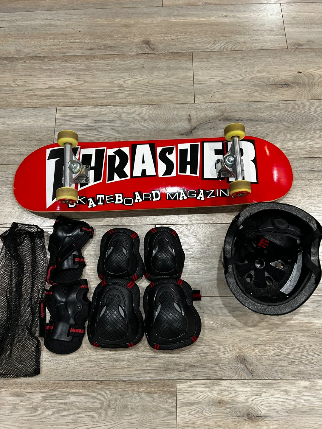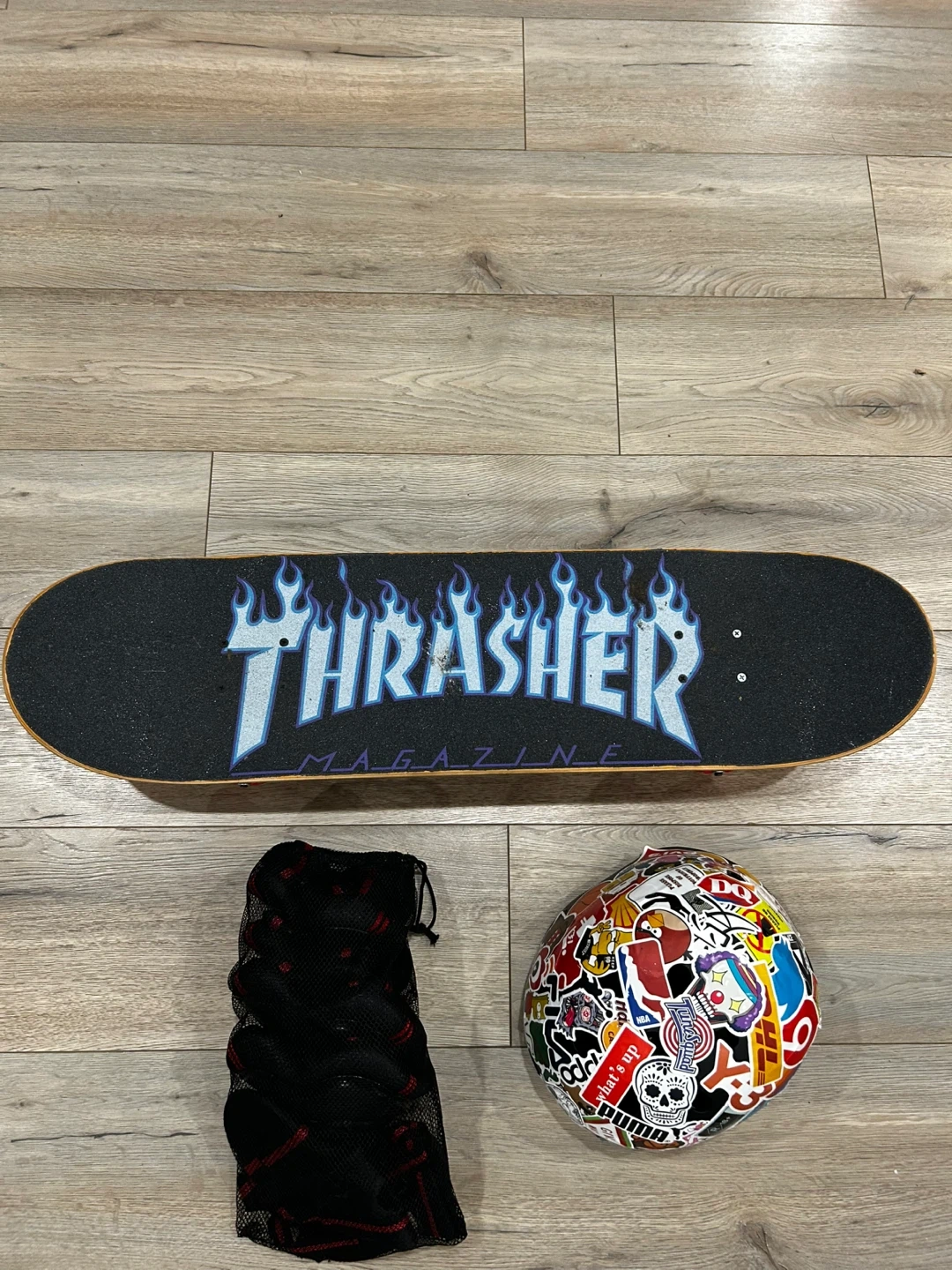 Selling a Thrasher skateboard with a helmet and pads set. Great for beginners or experienced skaters! Includes a skateboard, helmet covered with stickers, and a set of pads for elbows and knees. Perfect for getting started safely! Barely used few scratches. ⚠️I OWN ANIMALS⚠️