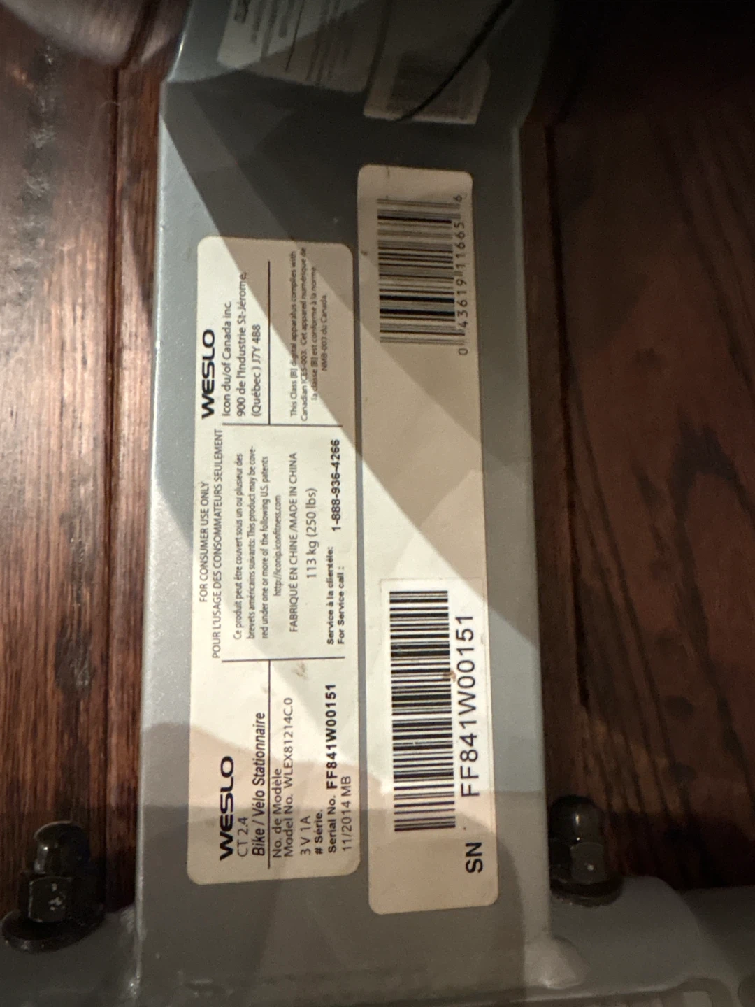 Selling a Weslo CT 2.4 Bike/Velo Stationaire. The model number is WLEX81114C.0 and the serial number is FF841W00151. It was manufactured in 2014 November.