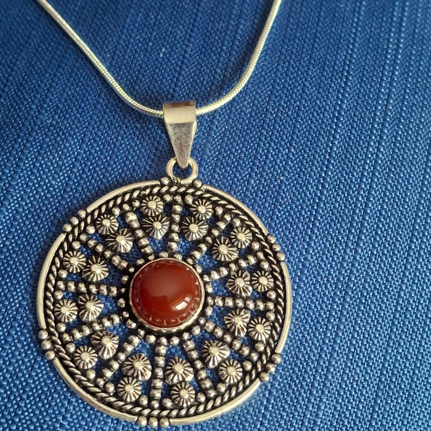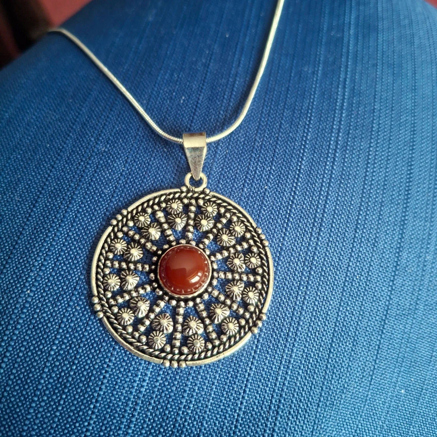 Selling a sterling silver medallion necklace. It features a circular carnelian gemstone pendant with a detailed floral pattern.