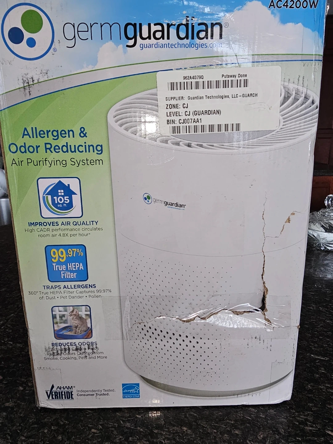 GermGuardian AC4200W air purifier. With 3 years limited warranty by the manufacturer. It's in great condition and ready to help improve your home's air quality. It’s designed to reduce allergens and odors, using a 360° True HEPA filter that captures up to 99.97% of airborne particles like dust, pet dander, and pollen. It’s best for rooms up to 105 sq ft, circulating air 4.8 times per hour. Includes the original box