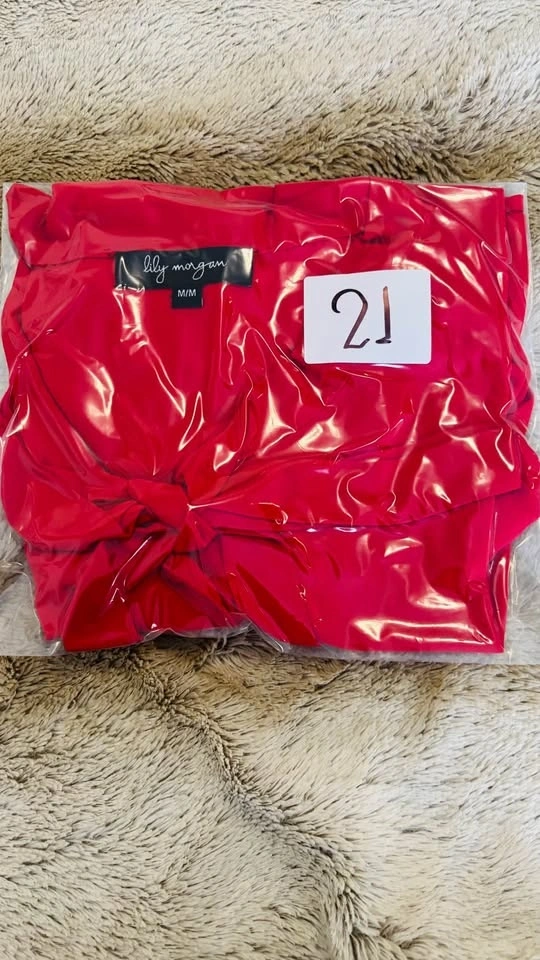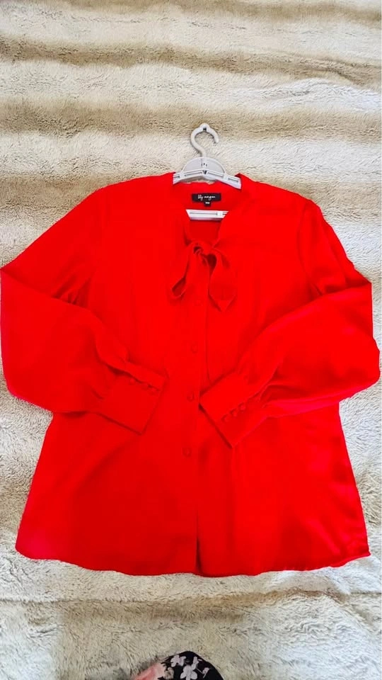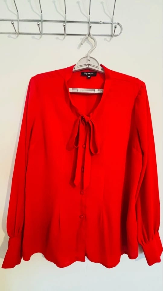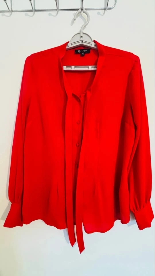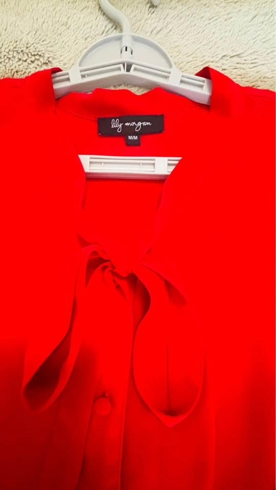 Beautiful bright red blouse by Lily Morgan, size Medium. Features a classic tie-neck detail, button front, and long sleeves with button cuffs. The fabric drapes nicely and gives an elegant, polished look—perfect for work, holidays, or dressing up a casual outfit.
