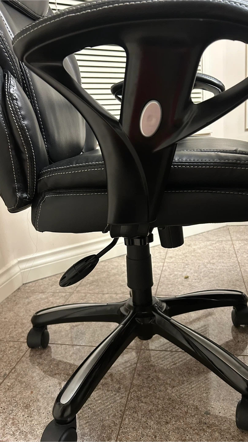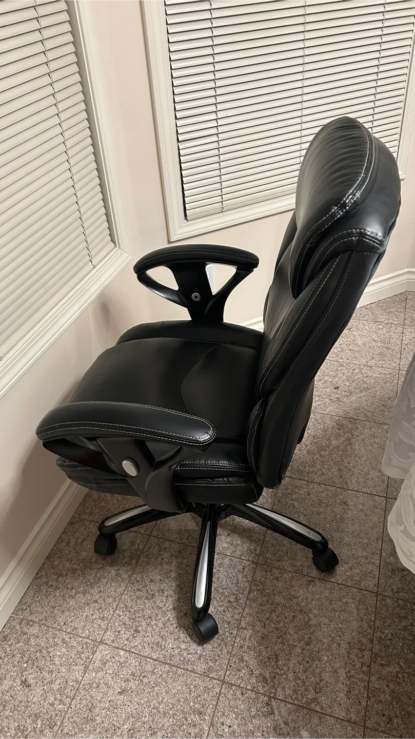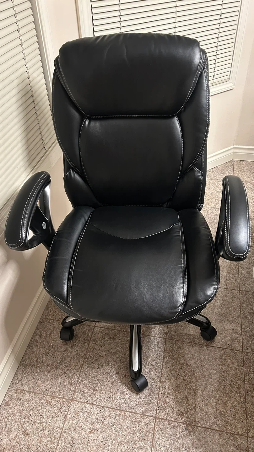 Selling a comfortable black leather office chair. It's in great condition and perfect for working from home or gaming! The chair features adjustable height and a supportive backrest.