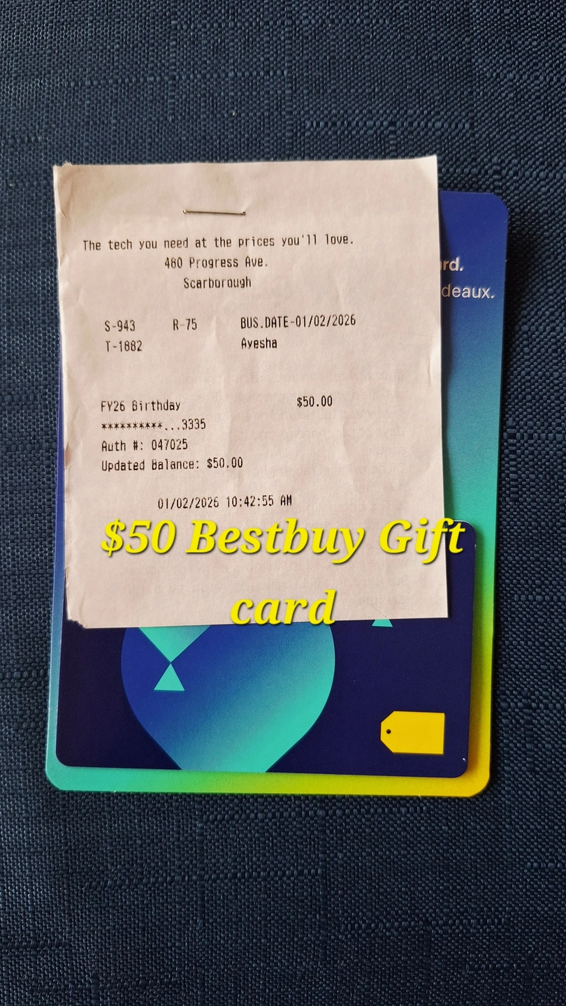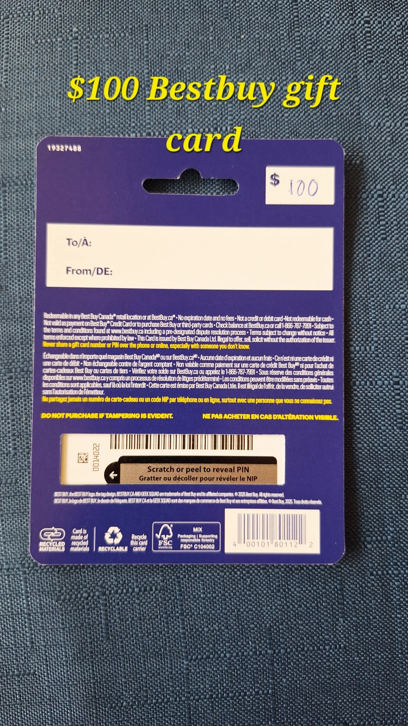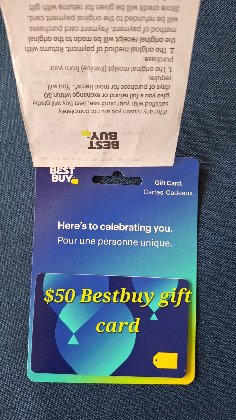 Selling two Best Buy gift cards with a total value of $150! It's a combination of a $100 card and a $50 card. Perfect for electronics or appliance shopping!