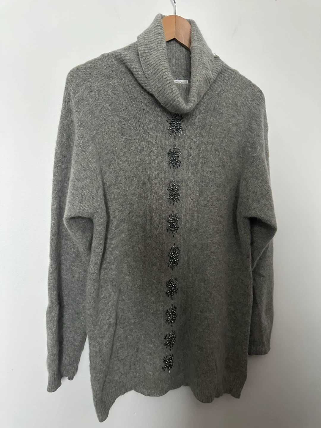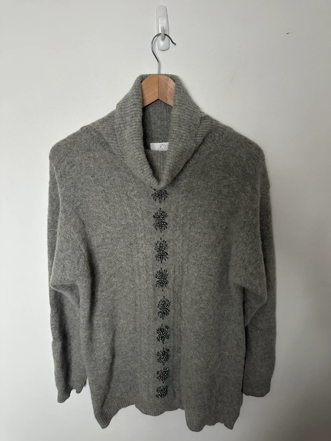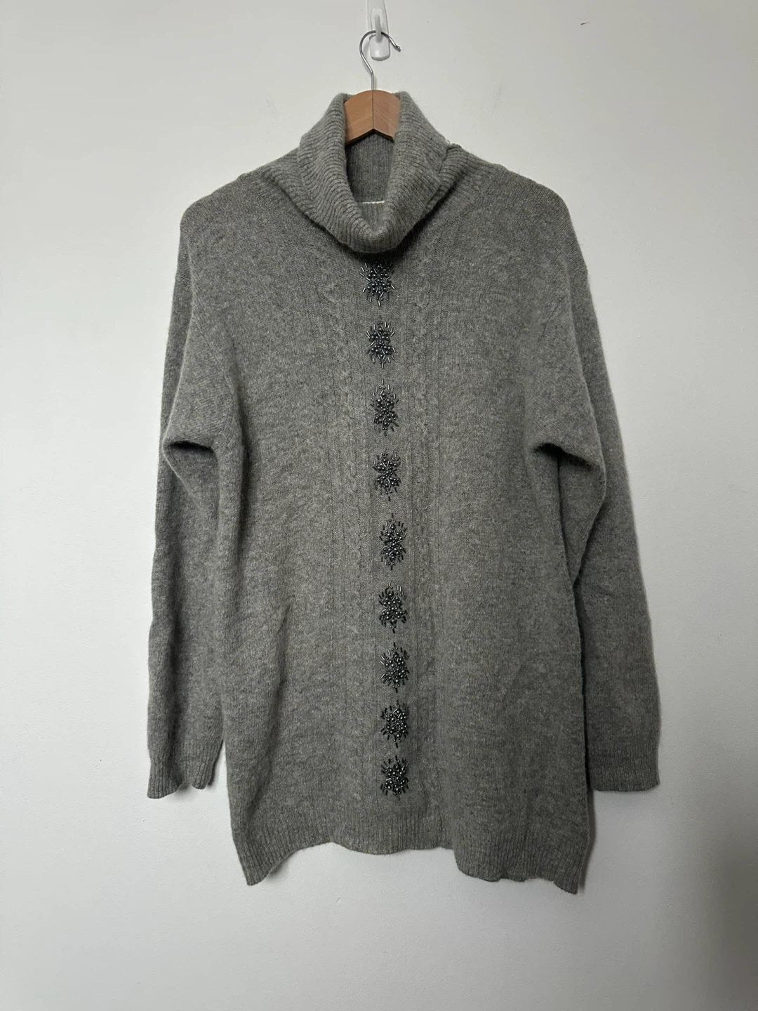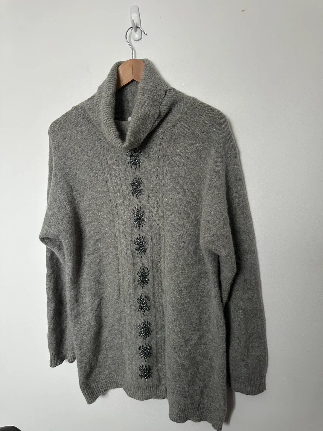 Here's a cozy grey turtleneck sweater with some lovely embellishments down the front! It's in great condition and ready to keep you warm this season. Sweater is long and cozy. Womens Medium.