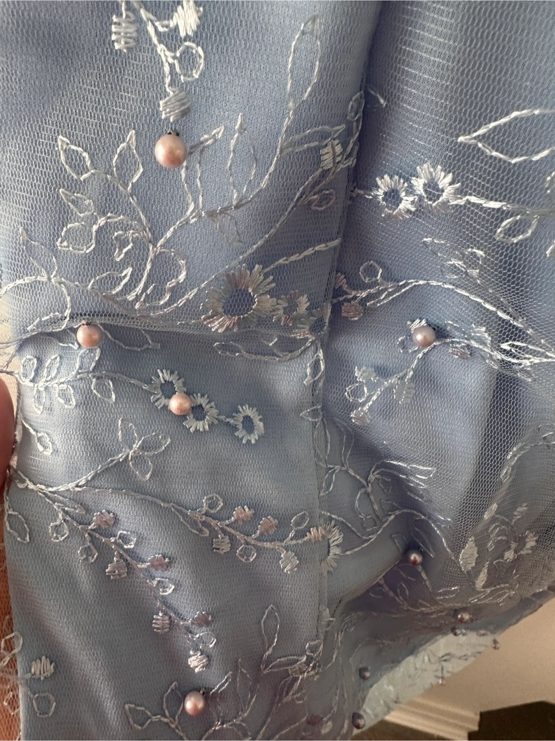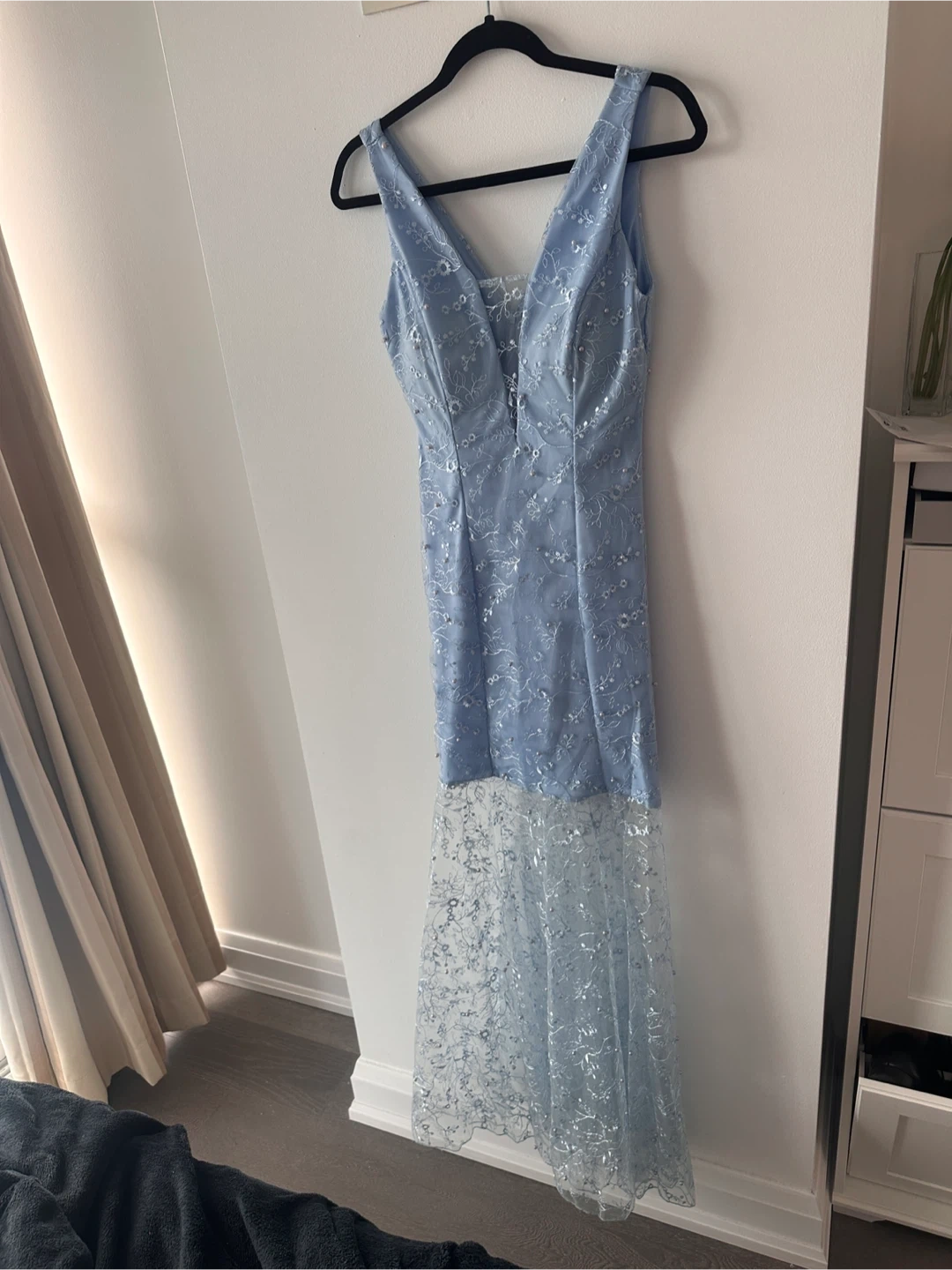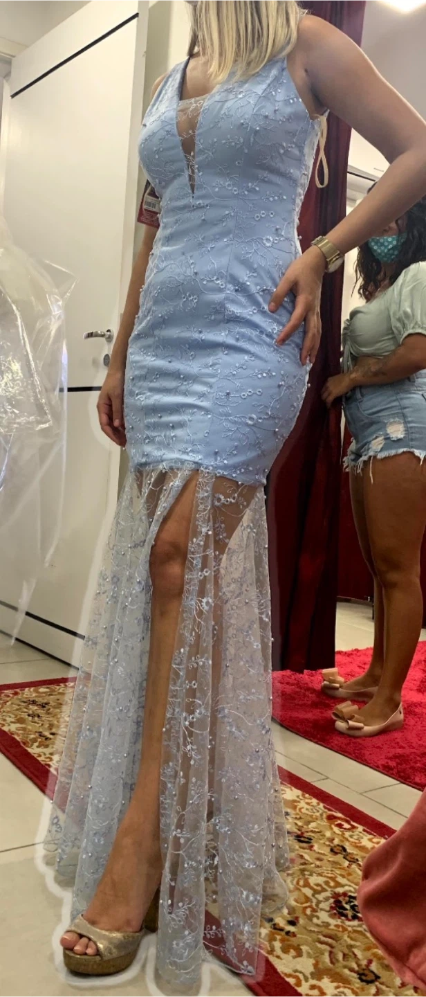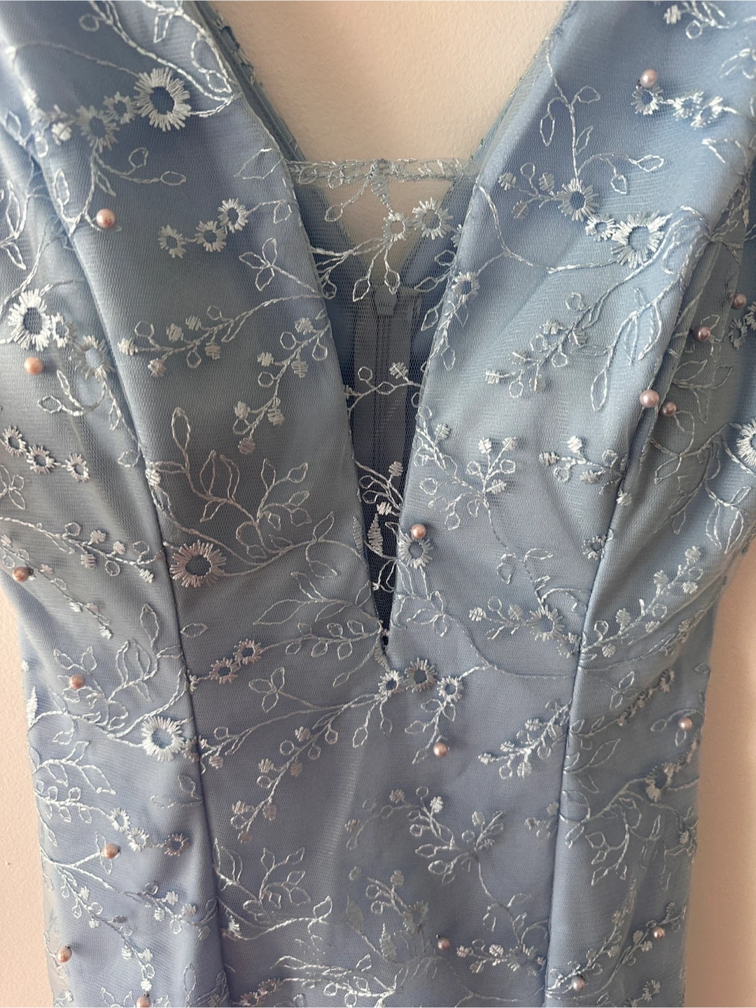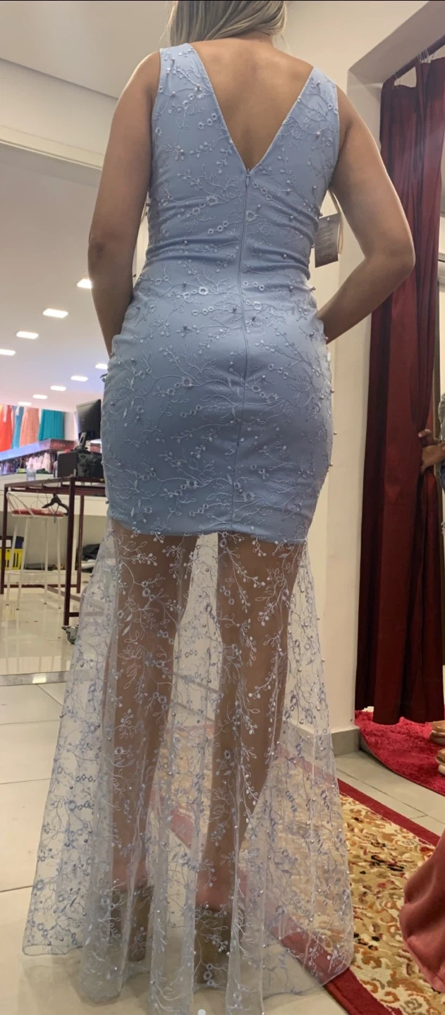 Beautiful blue dress with pearl detailing! It features a V-neck and a sheer lace skirt overlay. Perfect for a special occasion or a night out