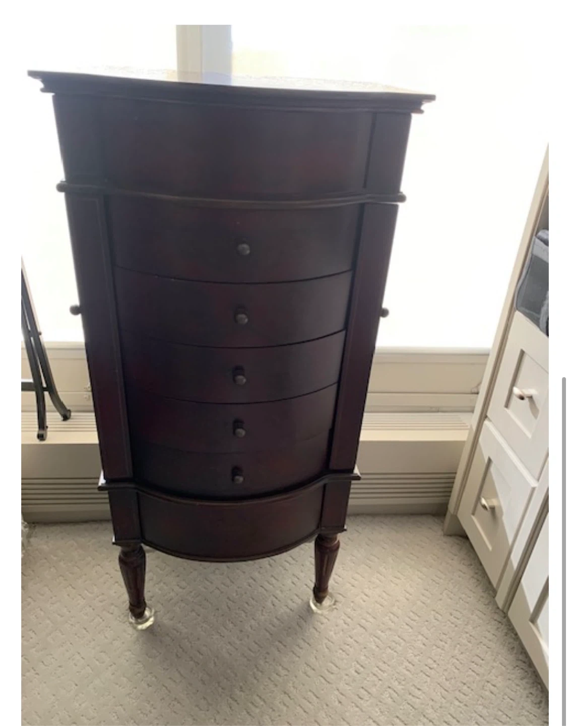 This elegant jewellery armoire is in good condition and features a rich, dark wood finish, offering ample storage with its multiple drawers and side compartments for necklaces and bracelets.
