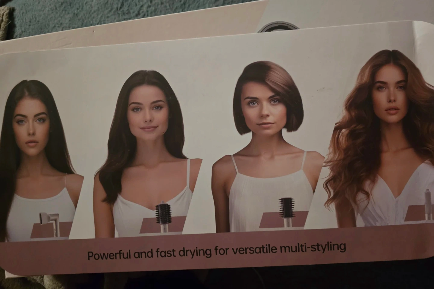 It includes a 34mm Airwrap curler, a round brush, a paddle brush, and a styling concentrator. The wand can be rotated to become a hairdryer. It's designed to control airflow, smooth out frizz, and quickly dry hair.