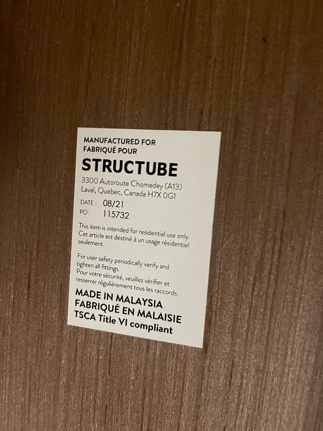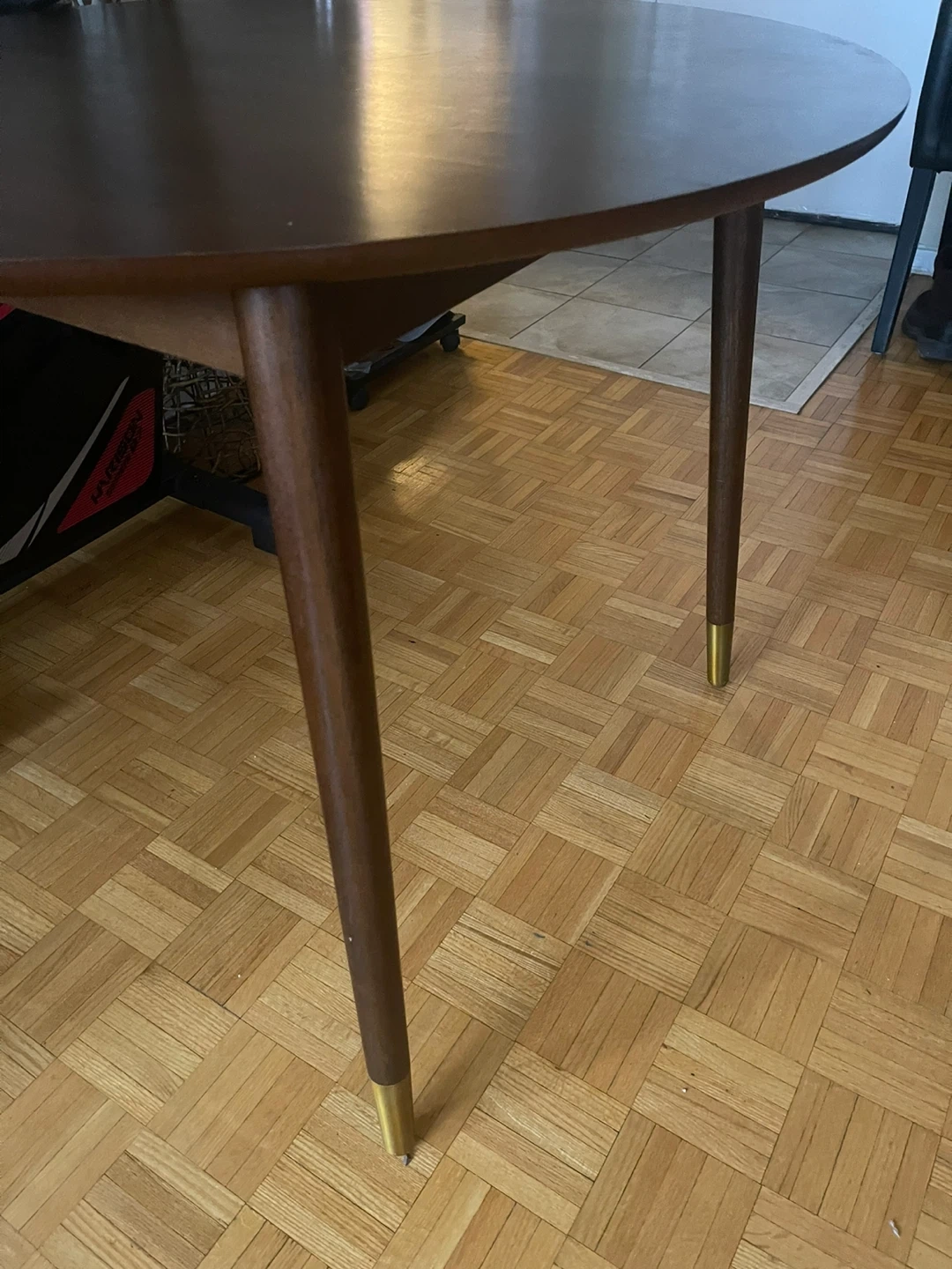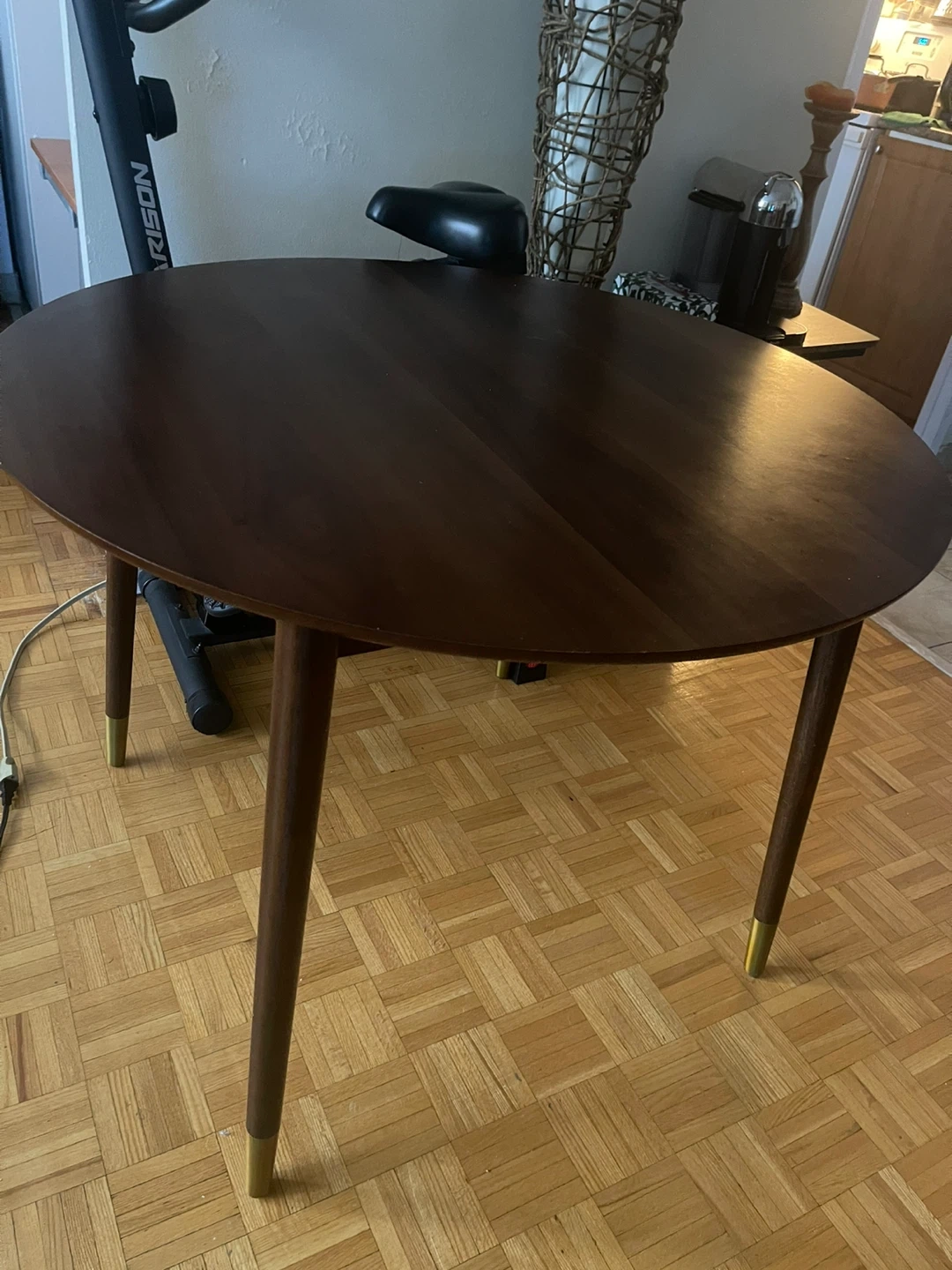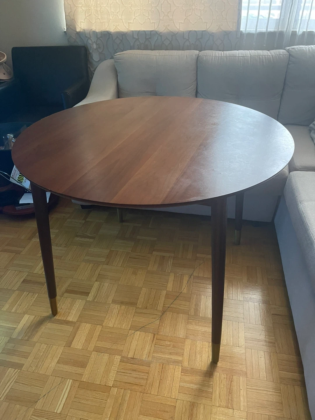Selling a Structube round wooden table. It's in great shape and perfect for a small dining area or kitchen. The table is made of wood with a dark brown finish and has a classic, simple design. The manufacturing date is August 2021.It’s 39.5 inches