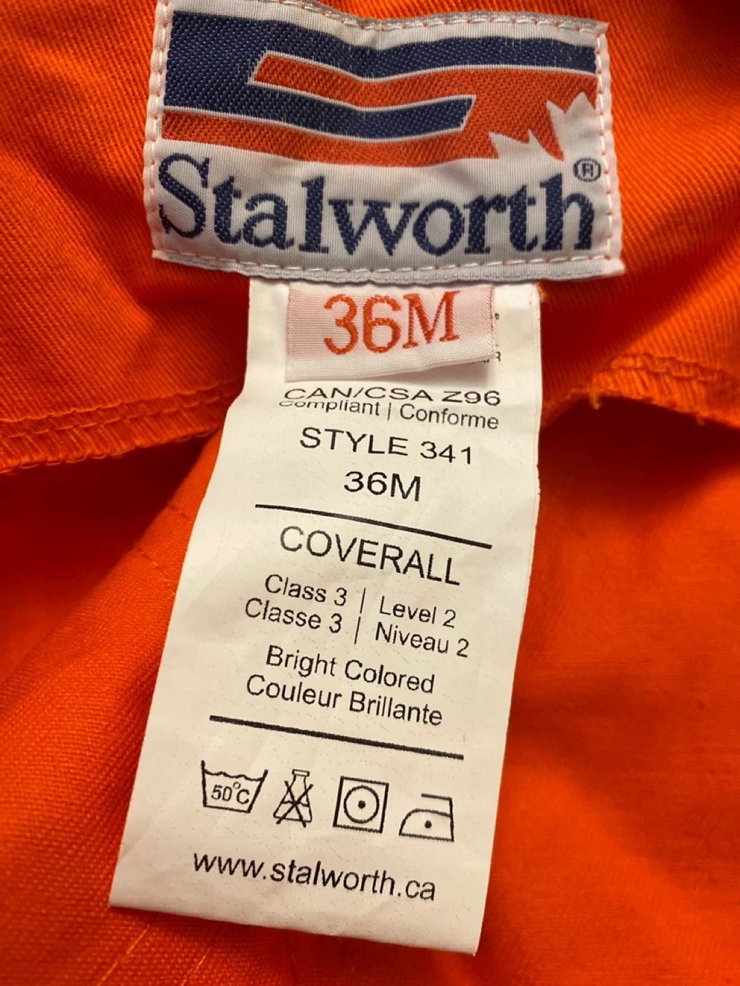 Selling a Stalworth orange coverall in size 36M. It's in NEW condition and ready for a new owner! The coverall is a bright colored, Class 3 Level 2 style 341.