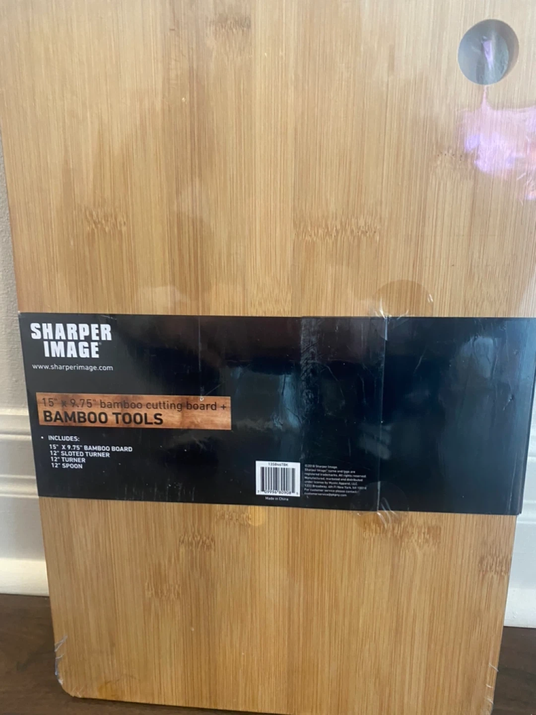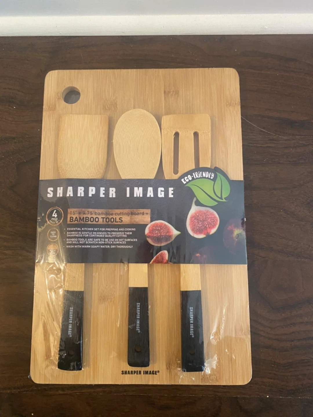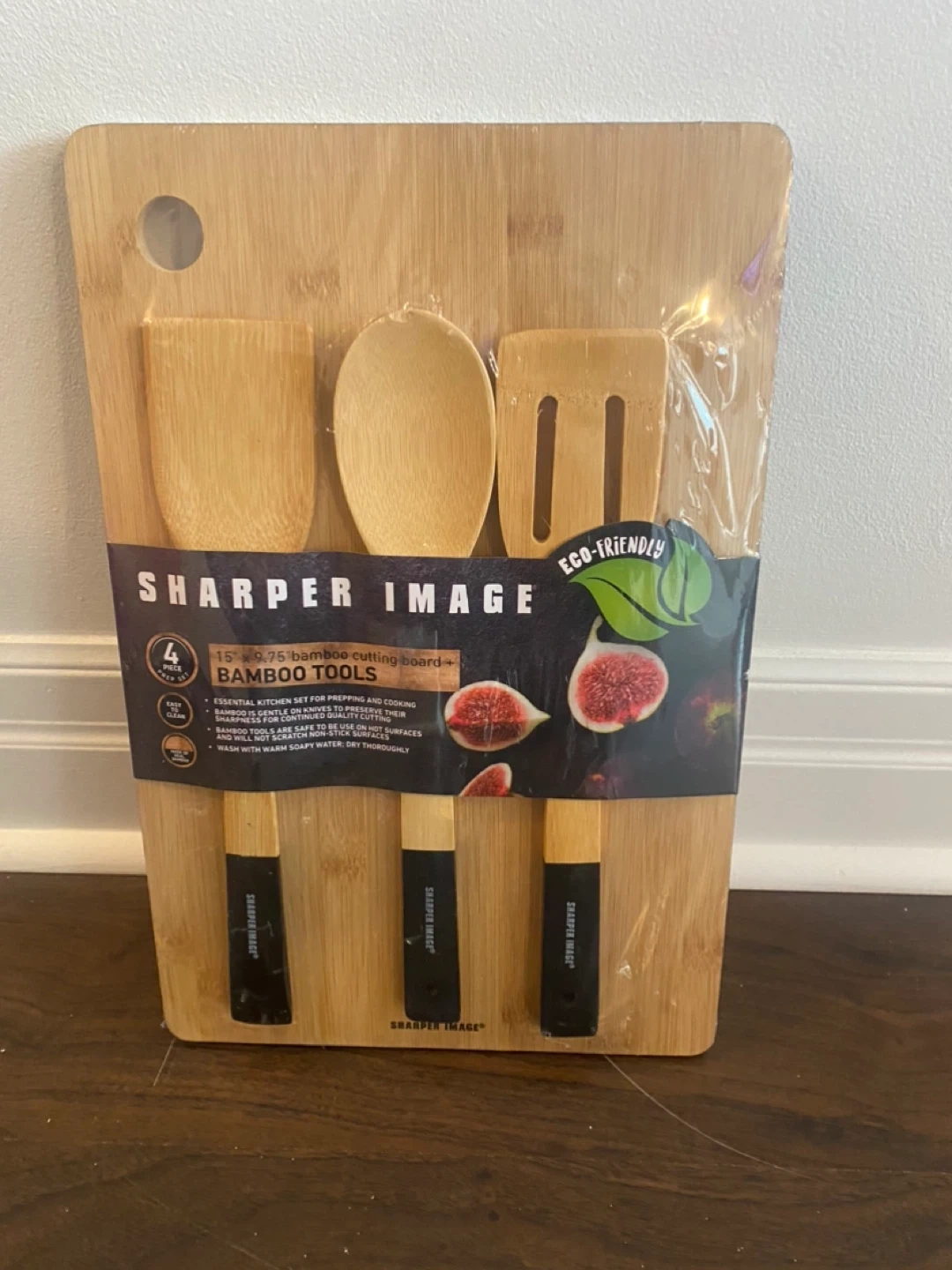 I'm selling a brand new Sharper Image 15" x 9.75" bamboo cutting board and tools set! It's an essential kitchen set for prepping and cooking. The set includes a bamboo board, slotted turner, and spoon. It's eco-friendly and easy to clean too