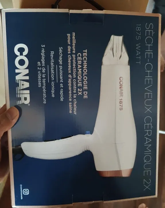 Selling a brand new Conair 1875 ceramic hair dryer, still in its original box! It features 2X ceramic technology for better heat protection and healthier-looking hair. It also has ionic technology for powerful and fast drying. It comes with 3 heat settings and 2 speed settings for customized styling