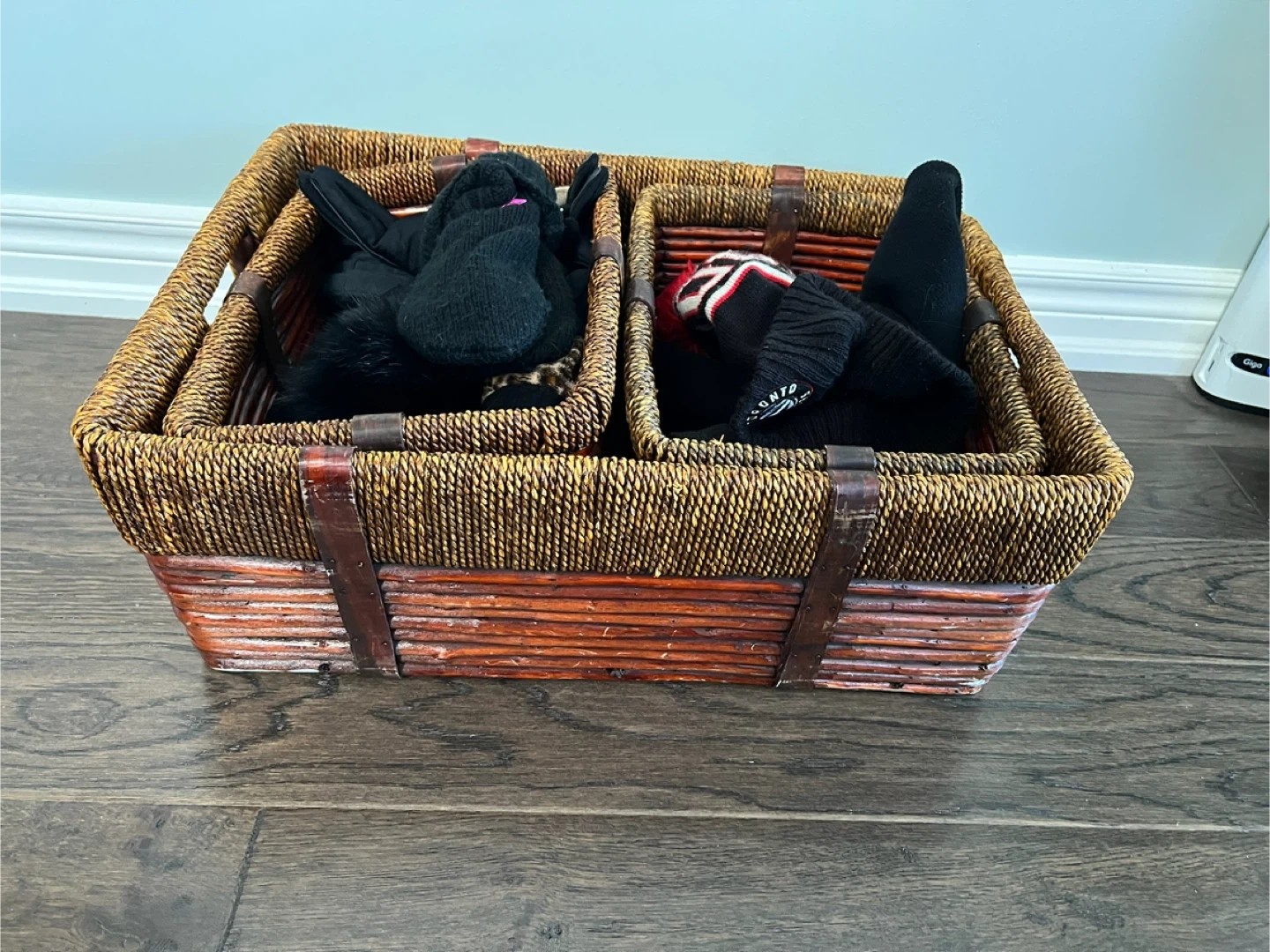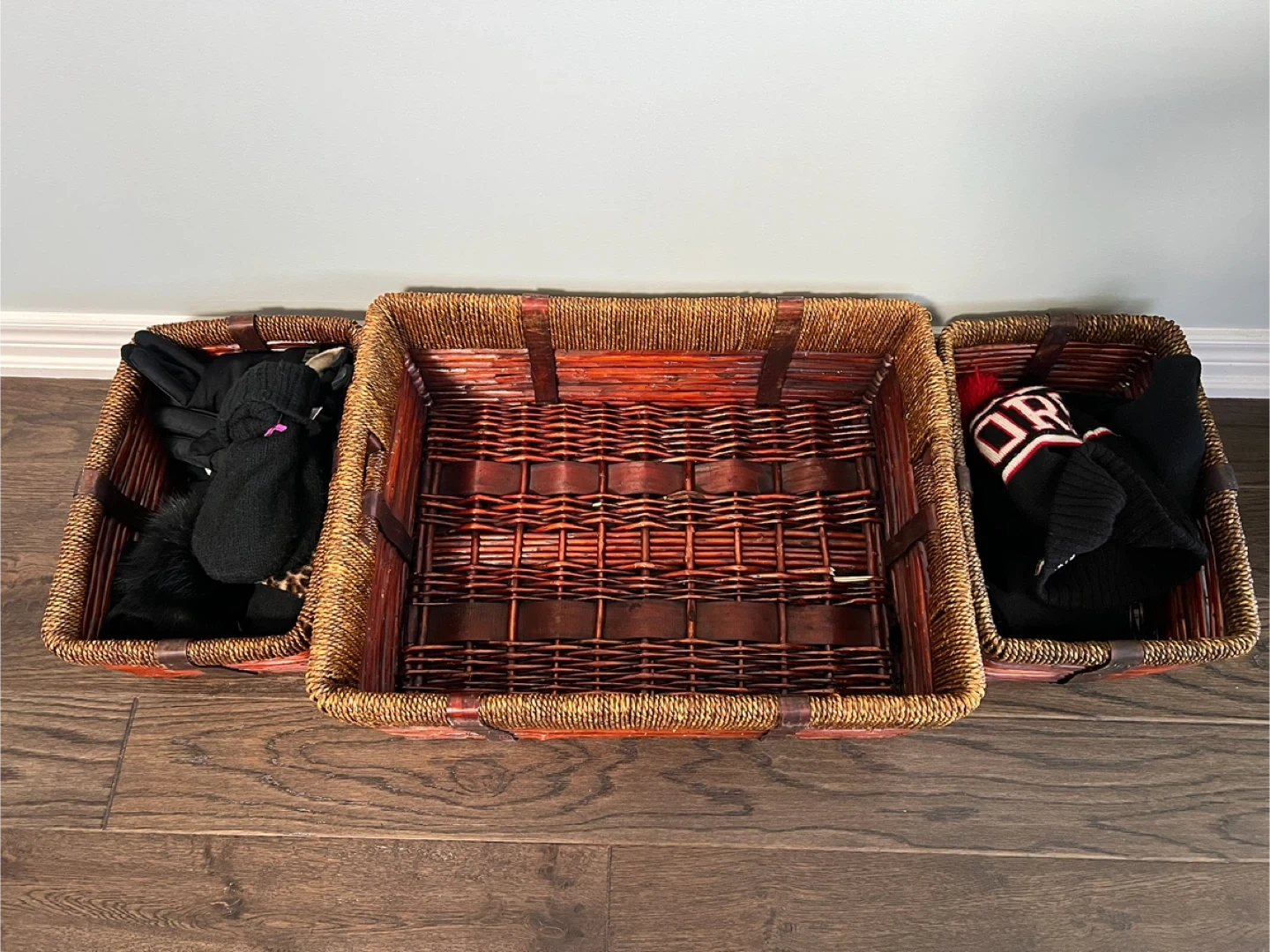 Selling a set of three wicker storage baskets. They are in great condition and perfect for organizing items around the house. The baskets have a warm, natural look that would fit well in any room. Great for storing blankets, toys, or other household items