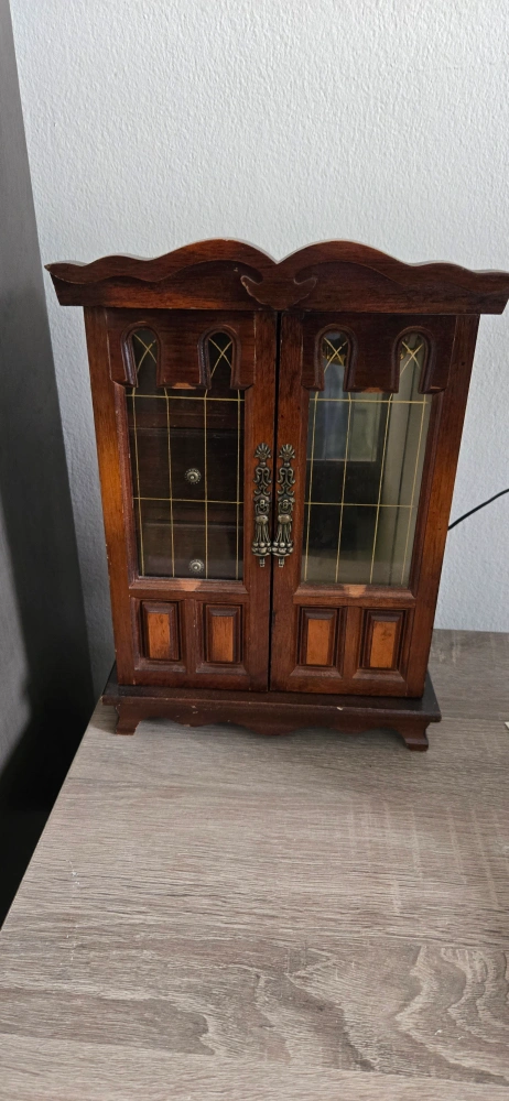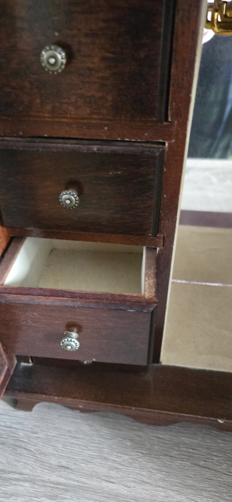 Selling a vintage armoire miniature wooden jewelry box with multiple drawers and a mirrored interior! It is also an old music box. it belonged to my mom and she bought it around the mid 1990s. she always took very good care of it. It has a classic design and would be perfect for storing your precious jewelry and accessories. It shows some signs of wear, but it's still in good condition for its age.