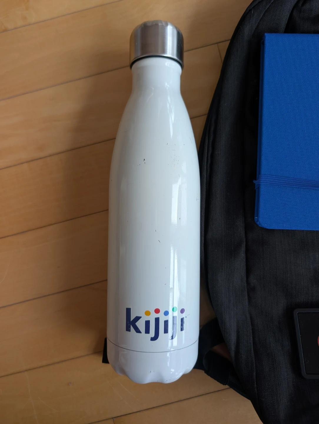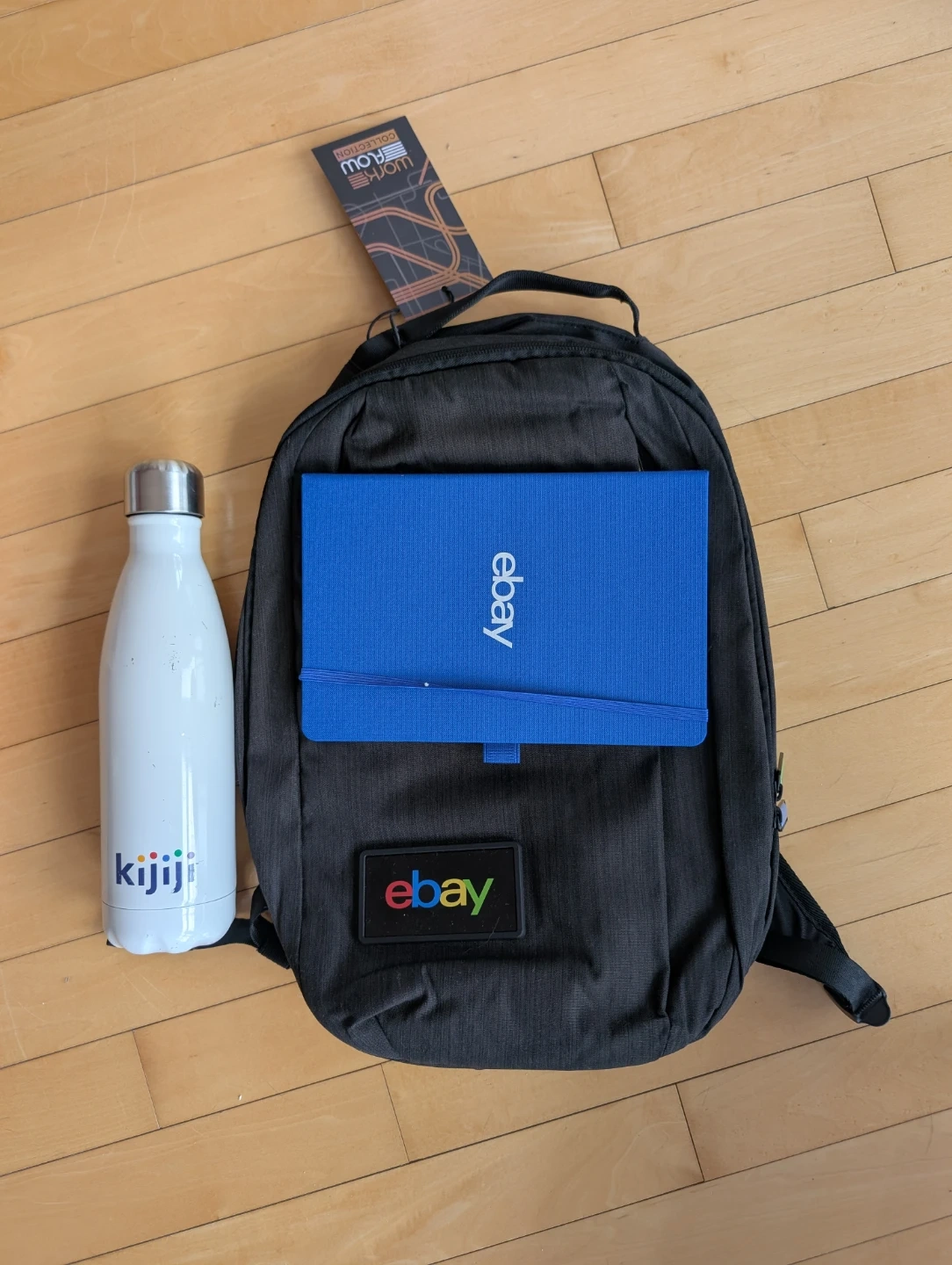 Giving away a new backpack with an eBay logo and a used Kijiji water bottle. Both are in good condition and ready for a new owner!