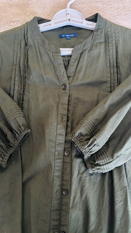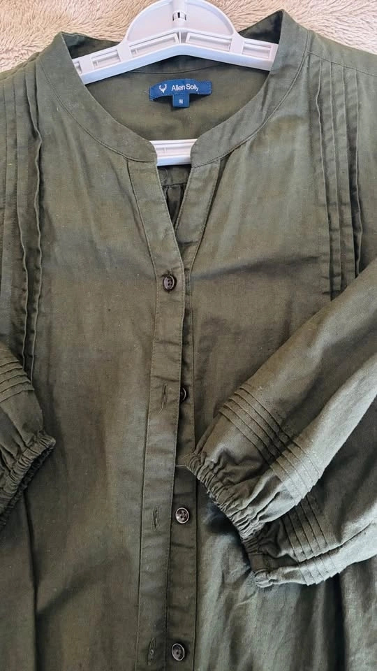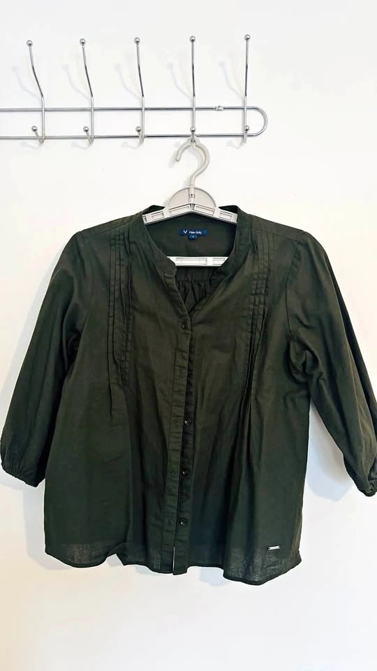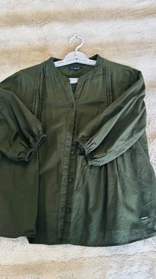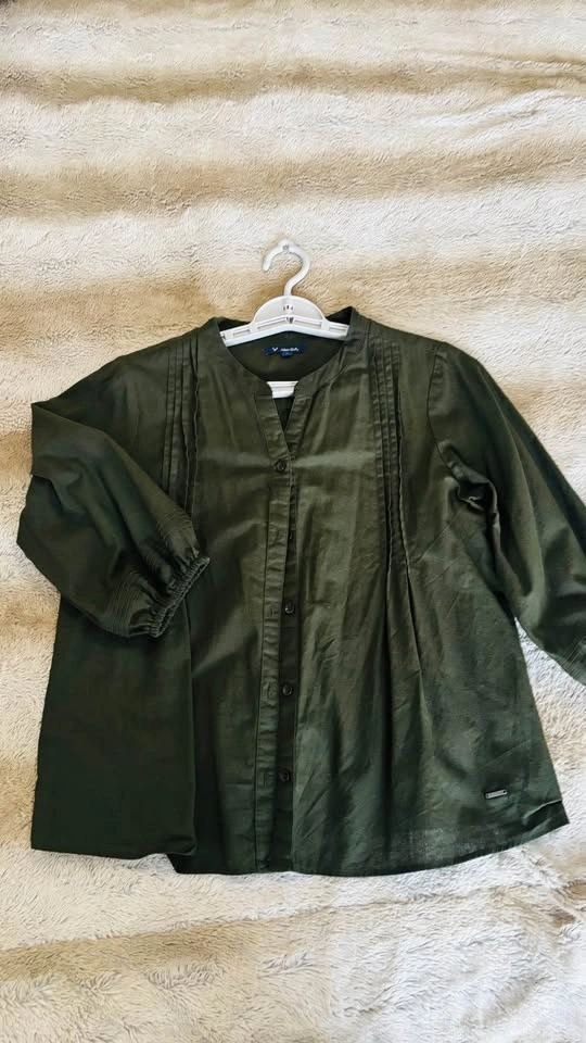 Elevate your everyday wardrobe with this sophisticated olive green blouse from Allen Solly. Featuring a unique mandarin-style collar and a button-down front, this top offers a perfect blend of casual comfort and professional polish.