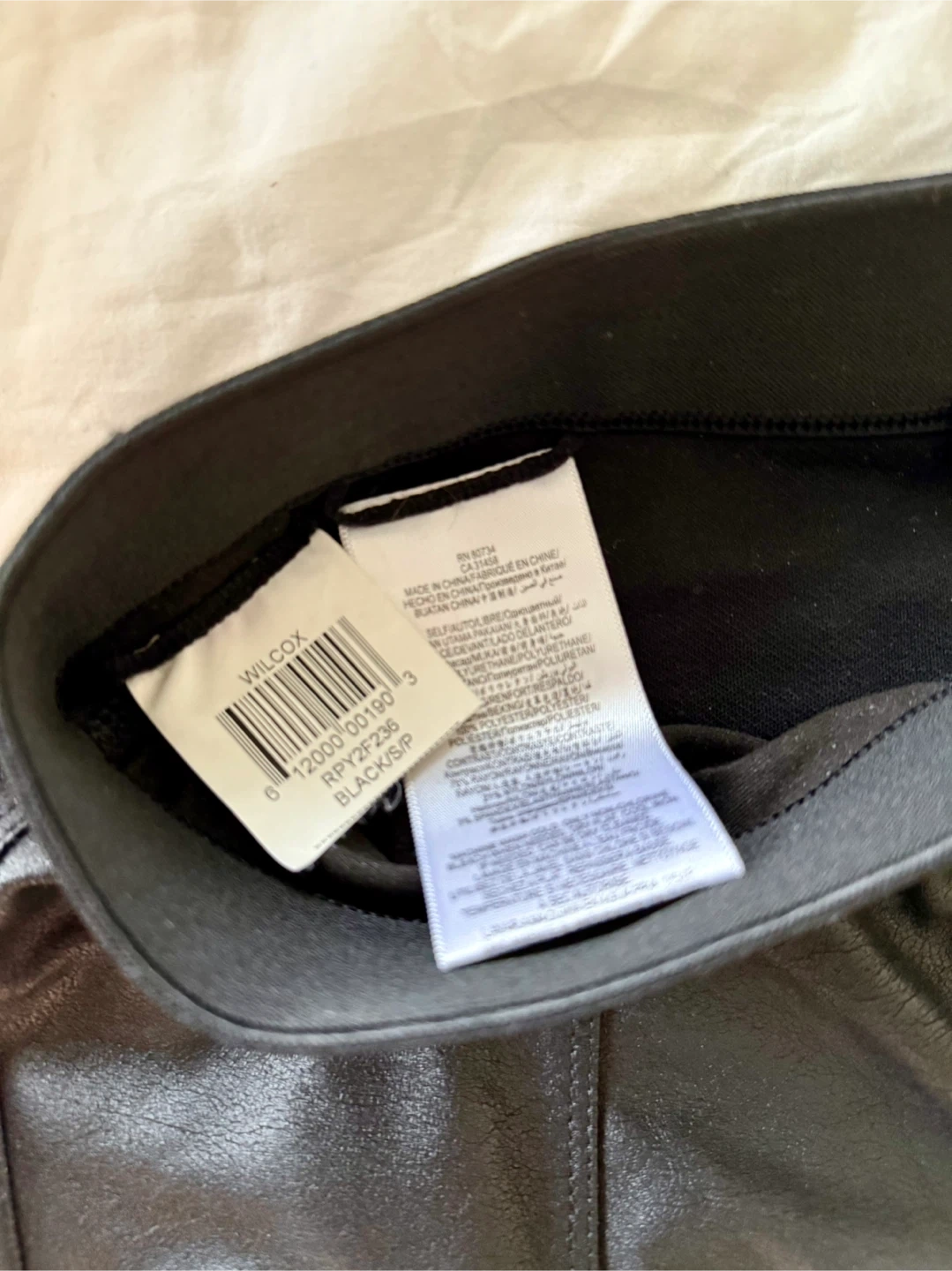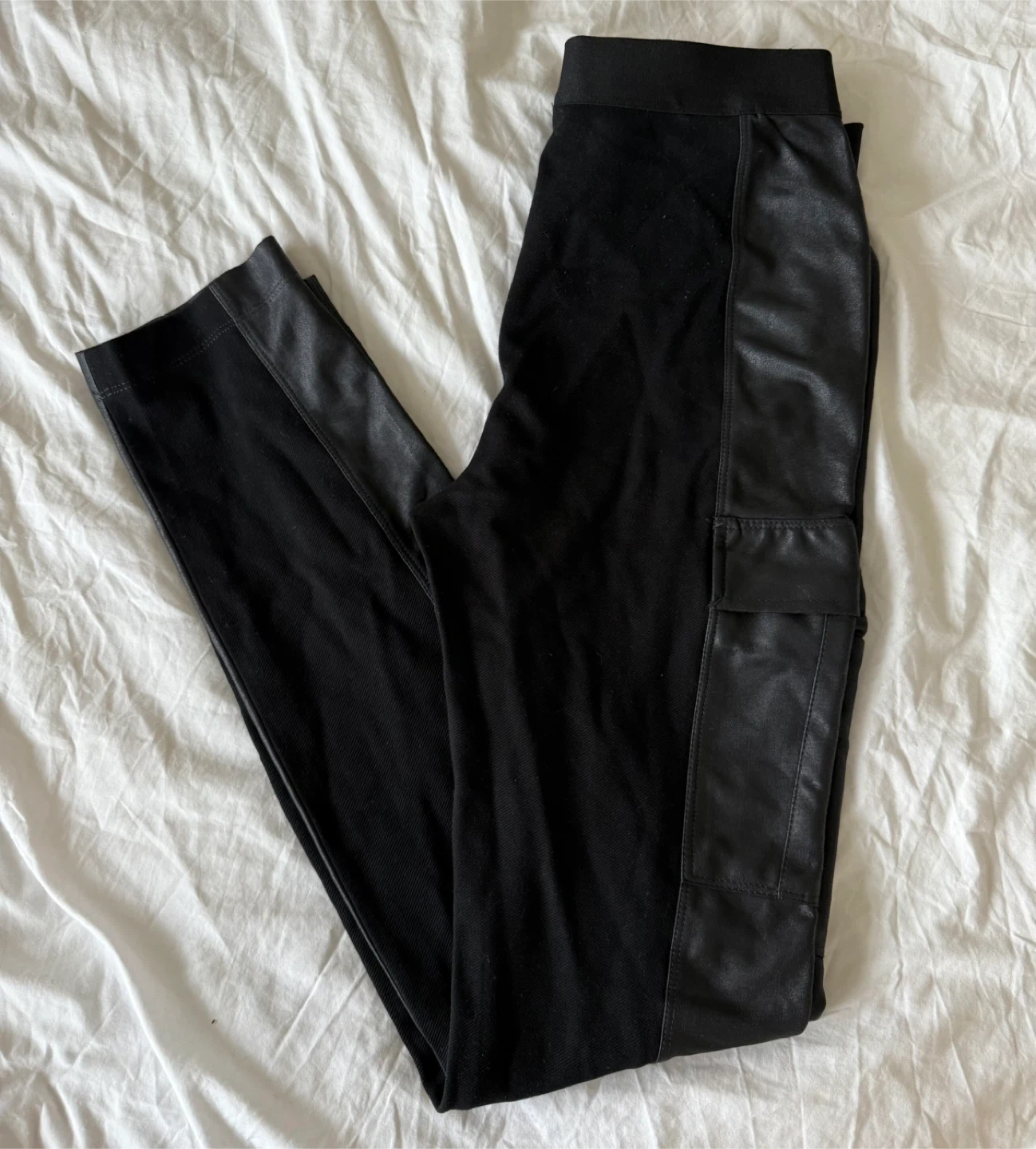 They feature a comfortable elastic waistband and a sleek faux leather finish.