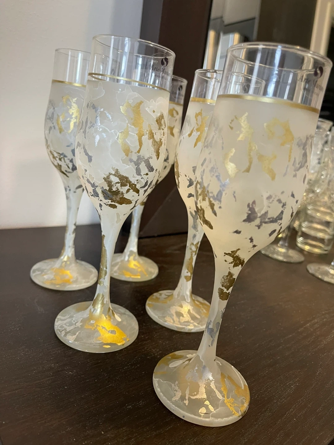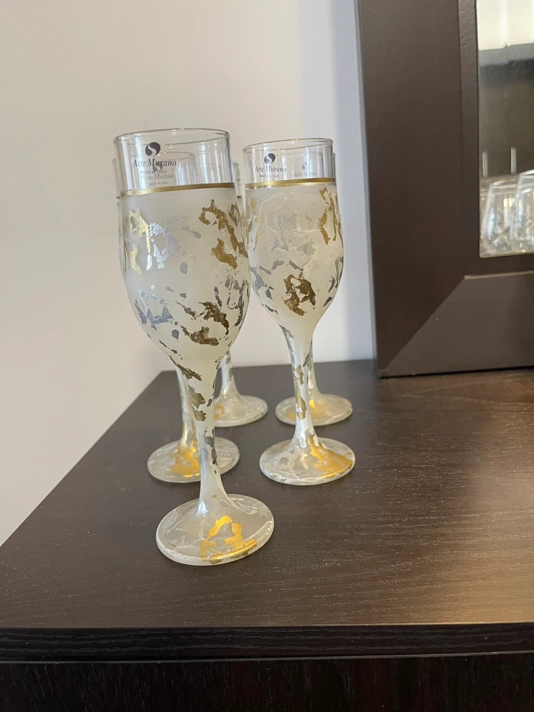 Selling a set of five Arte Murano champagne flutes. They feature a beautiful white and gold design, perfect for celebrations or adding a touch of elegance to your home