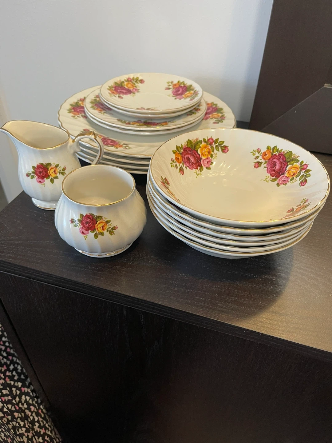 Selling a beautiful Royal Albert Old Country Roses dinnerware set. It includes plates, bowls, a creamer, and a sugar bowl. Perfect for adding a touch of elegance to your dining table!