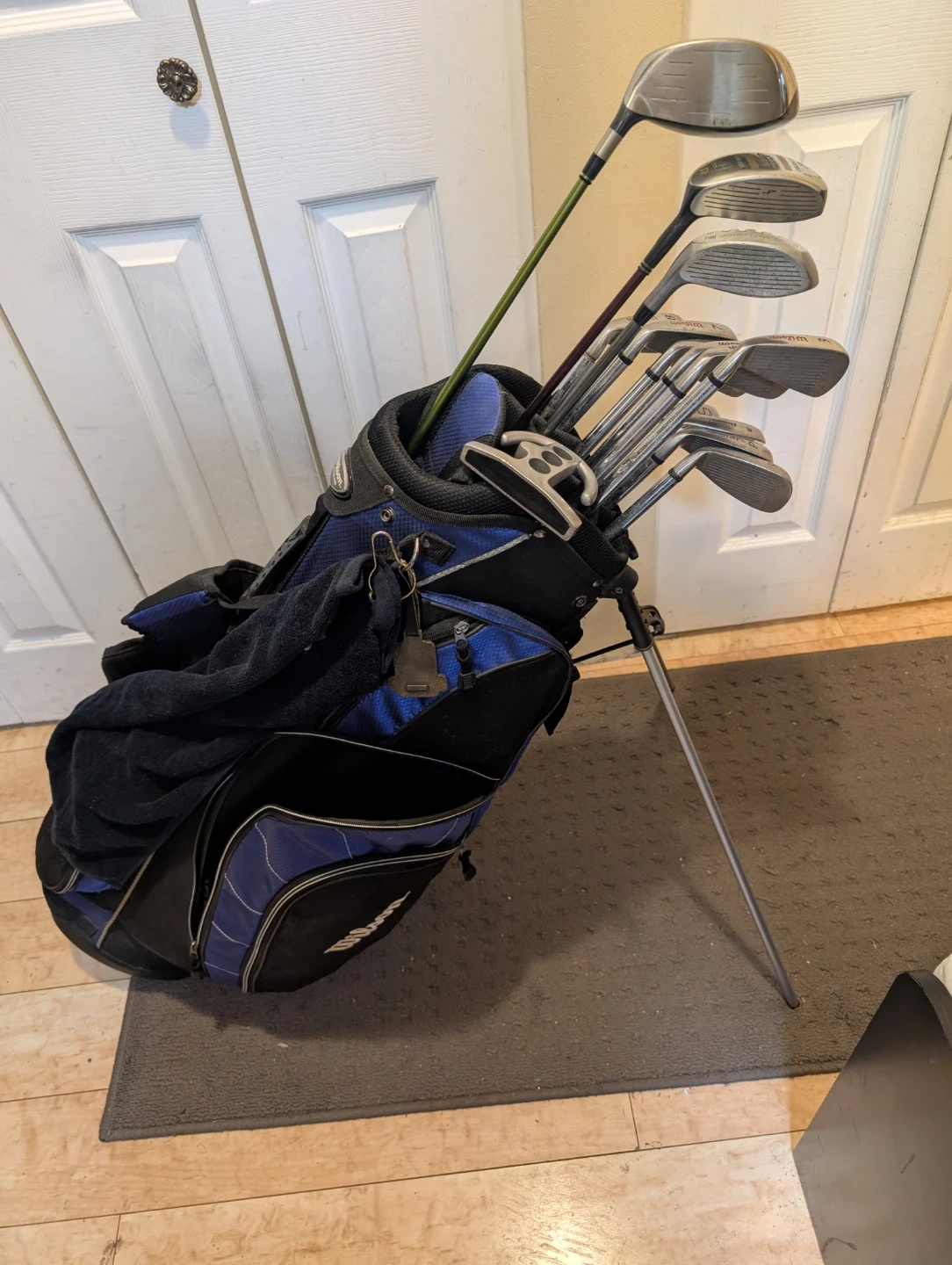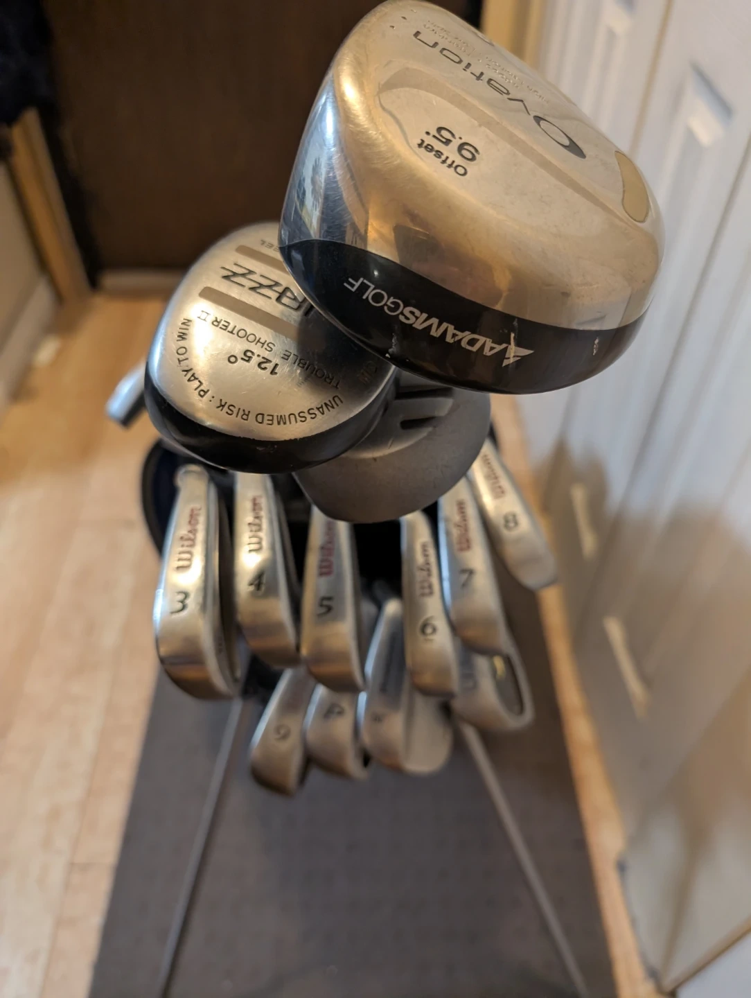 Selling a set of golf clubs including Wilson irons (3, 4, 5, 6, 7, 8, 9, P) and Adams drivers (Ovation 9.5 Offset, IRZZ Trouble Shooter II 12.5). 14 clubs in all. Irons are all matching custom made set from Golf Town. Enough tees to last a season, lots of balls, including 4 sleeves never opened. Has a pair of gently used all weather gloves, as well as a new Top Flyte glove, and a tracer ball that glows red after you hit it for twilight golf and finishing that last hole. All clubs in excellent shape and bag is like new. $200 and you are ready to hit the links. Just book a tee time. Will be a great set of clubs for someone to enjoy.