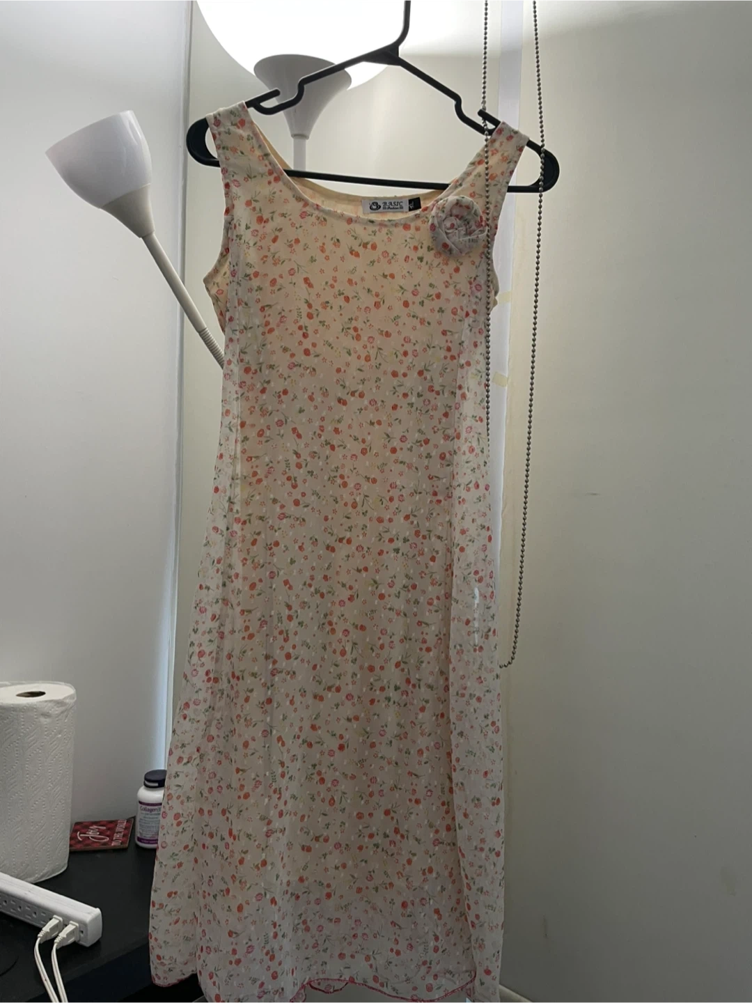 Selling a gently used floral sleeveless dress . It's in great condition and features a lovely floral pattern throughout. Perfect for summer or layering!